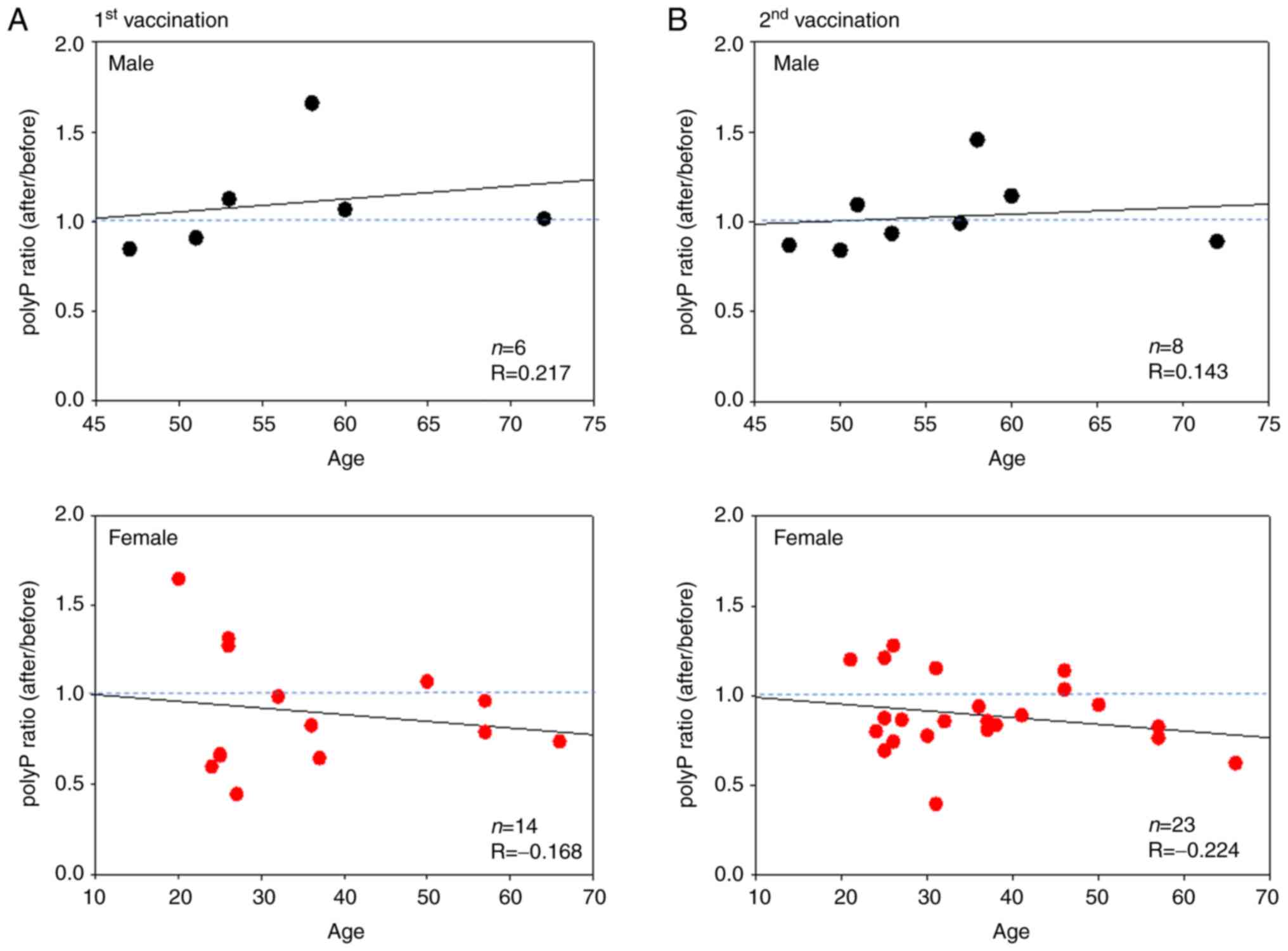 Scatter plots of the relationship between polyP ratios and age in terms of the Pfizer/BioNTech vaccine (BNT162b2) are shown in Fig. 4. In the male group, the correlation coefficients were weak (R=0.217) and very weak (R=0.143) for the first and second vaccinations, respectively. In the female groups, the correlations were again negative but very weak (R=-0.168) and weak (R=-0.224) for the first and second vaccinations, respectively.