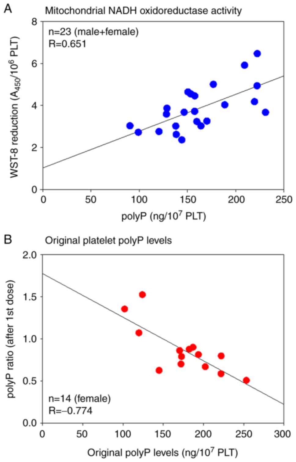 Scatter plots of the relationship between the WST-8 reduction and polyP levels, polyP ratios and pre-vaccination polyP levels for the Pfizer/BioNTech vaccine (BNT162b2) are shown in Fig. 5. Although polyP synthesis is not yet fully understood, several studies have suggested that mitochondria are involved in polyP synthesis in mammalian cells (34-36). To test this hypothesis, the mitochondrial activity and polyP levels were compared. In the group containing both male and female subjects, a strong correlation (R=0.651) was found between NADH activity, which is a proxy for mitochondrial activity, and platelet polyP levels (Fig. 5A). In the female group, after the first vaccination, a very strong negative correlation (R=-0.774) was found between the polyP ratio and the original platelet polyP levels (Fig. 5B).