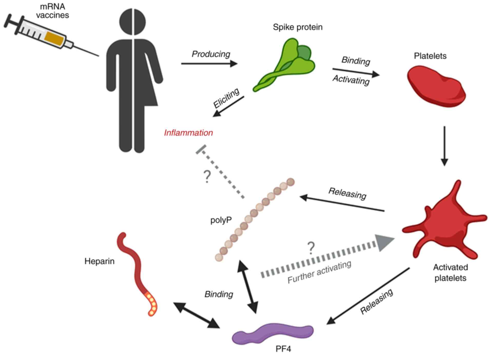 Recently, the primary mechanism of VITT has been explained by heparin-induced thrombocytopenia (48). Platelet factor 4 (PF4) released from activated platelets binds blood heparin to form the complex (PF4-heparin), which binds to IgG antibodies, then subsequently binds to platelet FcγRIIa receptors to further activate platelets to induce thrombosis (49-52). Interestingly, the authors who reported on this mechanism also mentioned the possibility that polyanions, such as polyP, may bind to PF4 to form the PF4-polyP complex and induce thrombosis (50). This possibility and the subsequent biological reactions should be further studied.