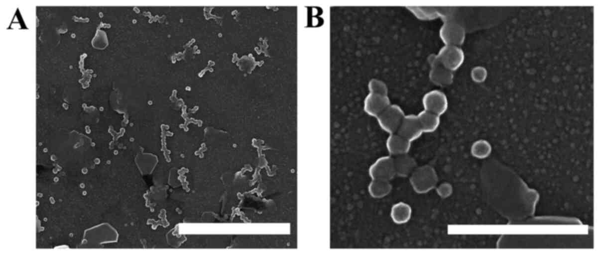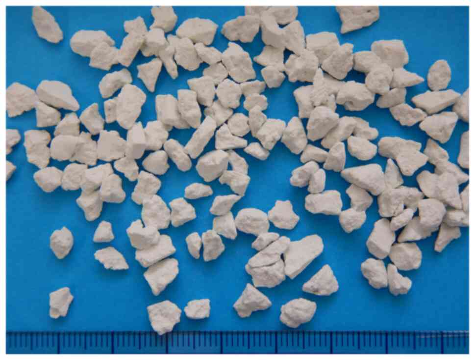 To obtain CAC-717, an electric field is applied to mineral water containing calcium bicarbonate (1,2,13,14). According to the Japanese patent No. 5778328, CAC-717 (Food and Drug Administration/USA Regulation no. 880.6890 Class 1 disinfectant) is produced by applying a voltage of 2x104 V for 48 h using Teflon-coated electrostatic-field electrodes (2). The resulting material has a pH of approximately 12.4 and contains 6.9 mM calcium bicarbonate particles (81,120 mg/l) with a mesoscopic structure (50-500 nm) that can be observed under an electron microscope (Fig. 1). CAC-717 is adsorbed onto a ceramic surface and air-dried for storage in the form of CAC-717 stones (Fig. 2). Prior to use, the CAC-717 stones are placed in fresh distilled water, calcium bicarbonate is dissolved, and CAC-717 is reconstituted. Reconstituted CAC-717 has the same microbicidal properties as original CAC-717.