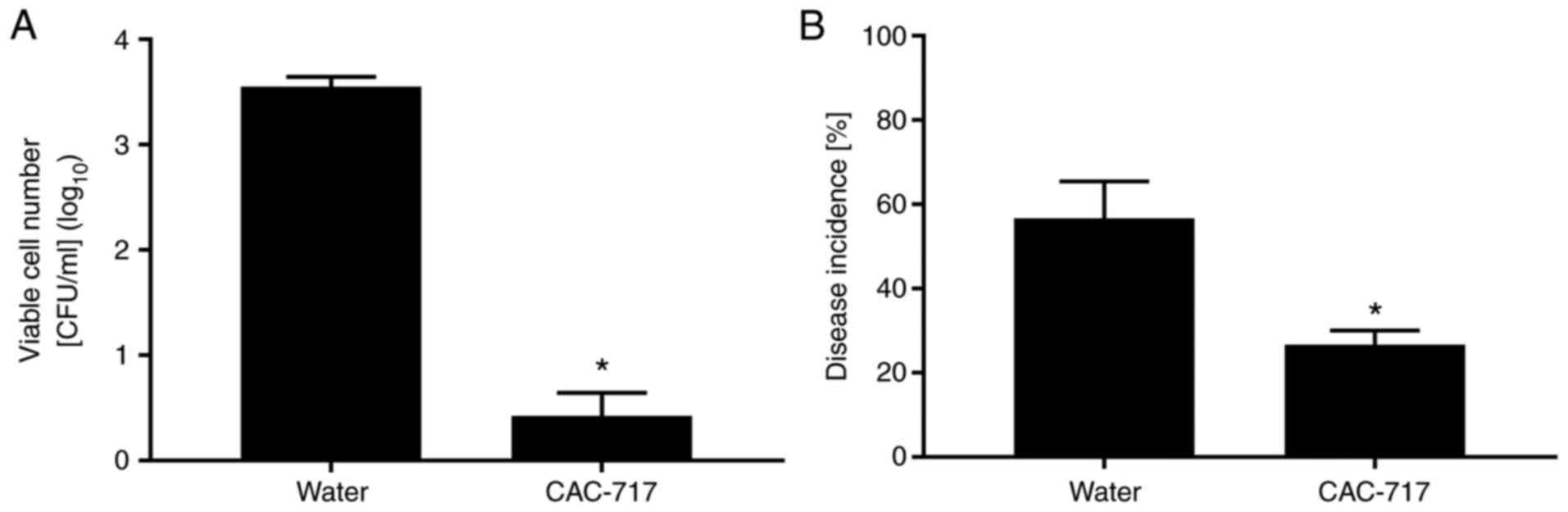 CAC-717 has been shown to be effective in inactivating plant pathogens (14). Black rot is a disease affecting cabbage and other cruciferous plant leaves, and is caused by Xanthomonas campestris pv. campestris (Xcc), a gram-negative seed-borne bacterium (15). The number of viable Xcc cells after treatment with CAC-717 was determined. An Xcc suspension (8.22 log10 colony-forming units/ml) was incubated with an equal volume of CAC-717 at 25˚C for different periods of time (Table I). CAC-717 treatment caused a decrease in the number of Xcc cells after 0.5 min (Fig. 3A). In control experiments, no significant reduction in the number of Xcc cells was observed after treatment with distilled water at 25˚C; whereas hot water (50˚C) treatment significantly decreased the number of Xcc cells (14). In test samples, CAC-717 caused a low incidence of black rot, with only 26.77±3.33% of seeds exhibiting signs of disease after incubation at 25˚C for 5 days, compared with 56.67±8.82% in the distilled water group (Fig. 3B). No significant difference in the germination rate and plant stem length was detected between distilled water (25˚C) and CAC-717 treatment after cultivation for 5 days.