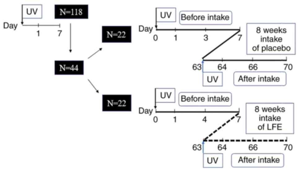 The purpose of the study was to clarify the effects of LFE ingestion on UVB-induced skin erythema. After screening, participants were recruited from among 118 individuals in the Exam's volunteer bank, which was managed by Derma Labo. Inc, who agreed to participate. Participants were Japanese nationals aged between 20 and 60 years of age.