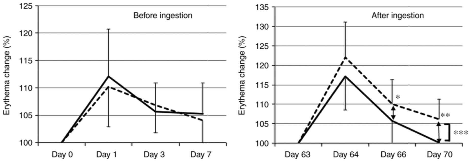 Statistical analysis was performed using Microsoft Excel 2013 (Microsoft Corporation). A paired Student's t-test was used for intragroup comparisons. Multivariate regression analysis was used to compare changes in MED between the two groups. Covariance analysis was used for erythema time series results, including for time point comparisons. An unpaired Student's t-test was used for the corresponding time points. All values are presented as the mean ± SD. P<0.05 was considered to indicate a statistically significant difference.