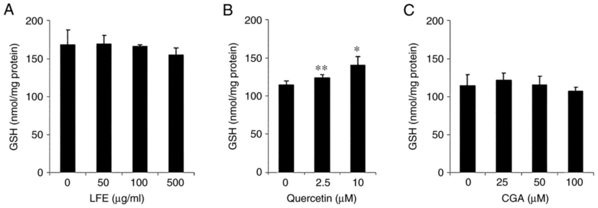 Fig. 4 shows the effect of LFE upon intracellular total GSH, which was determined using the DTNB method. Quercetin increased total GSH at concentrations of 2.5 and 10 µM, LFE and chlorogenic acid showed no significant effect for increasing total GSH in HaCaT cells, even though LFE has been reported to enhance the cellular GSH level in hepatocytes (30).