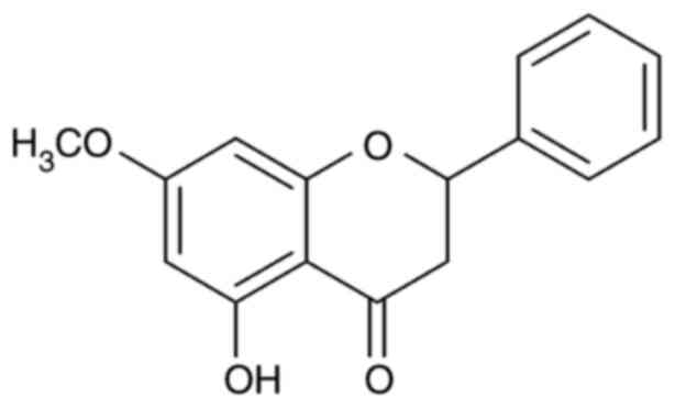 Fresh rhizomes of B. rotunda were collected from Phayao, Thailand. The voucher specimen (no. S. Sedlak 19-1) was authenticated by the Walai Rukhavej Botanical Research Institute, Mahasarakham University, Maha Sarakham, Thailand. The ethanolic crude extract (251 g) was resuspended in methanol to yield a pale yellow methanol-insoluble solid (50 g). The obtained solid was further subjected to an open column chromatography using silica gel (Arch. No. 7734, pore size 60 Å, particle size 70-230 mesh, Merck) as an adsorbent. The column was eluted with the mixture of 40-80% dichloromethane-hexane under gradient separation. The similar pattern fractions were combined based on thin-layer chromatography analysis and recrystallized with methanol to yield pure pinostrobin, while the purity was found to be >98% based on HPLC analysis. Structural elucidation was performed using 13C- and 1H-NMR spectroscopy (Bruker Avance DRX500 Spectrometer) and the NMR spectra were compared with those in the published literature (25) as follows: 1H NMR (500 MHz, acetone-d6): 2.80 (dd, J=17.2, 3.0 Hz; 1H, H-3a), 3.06 (dd, J=17.2, 13.0 Hz; 1H, H-3b), 3.79 (s, 3H; -OCH3), 5.39 (dd, J=13.0, 3.0 Hz; 1H, H-2), 6.06 (m, 2H, H-6, H-8), 7.41 (m, 5H; H-2', H-3', H-3', H-5', H-6'). 13C NMR (150 MHz, acetone-d6): 43.1 (C-3), 55.7 (C-7-OCH3), 79.2 (C-2), 94.3 (C-8), 95.1 (C-6), 103.1 (C-10), 126.1 (C-2', C-3', C-5', C-6'), 128.9 (C-4'), 138.4 (C-1'), 162.8 (C-5), 164.1 (C-9), 167.9 (C-7), 195.8 (C-4). (NMR data were recorded on January 13, 2021, Central Science Laboratory, Faculty of Science, Chiang Mai University, Thailand). The chemical structure of pinostrobin is illustrated in Fig. 1.