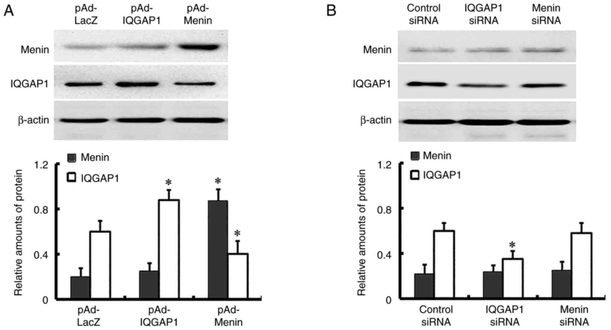 The authors would like to thank Dr Yong-Chang Chen (Jiangsu University, Zhenjiang, China) for providing the adenoviral vectors pAd-LacZ (encoding β-galactosidase), pAd-IQGAP1 and pAd-Menin, as well as the human gastric epithelial cell line, GES-1.