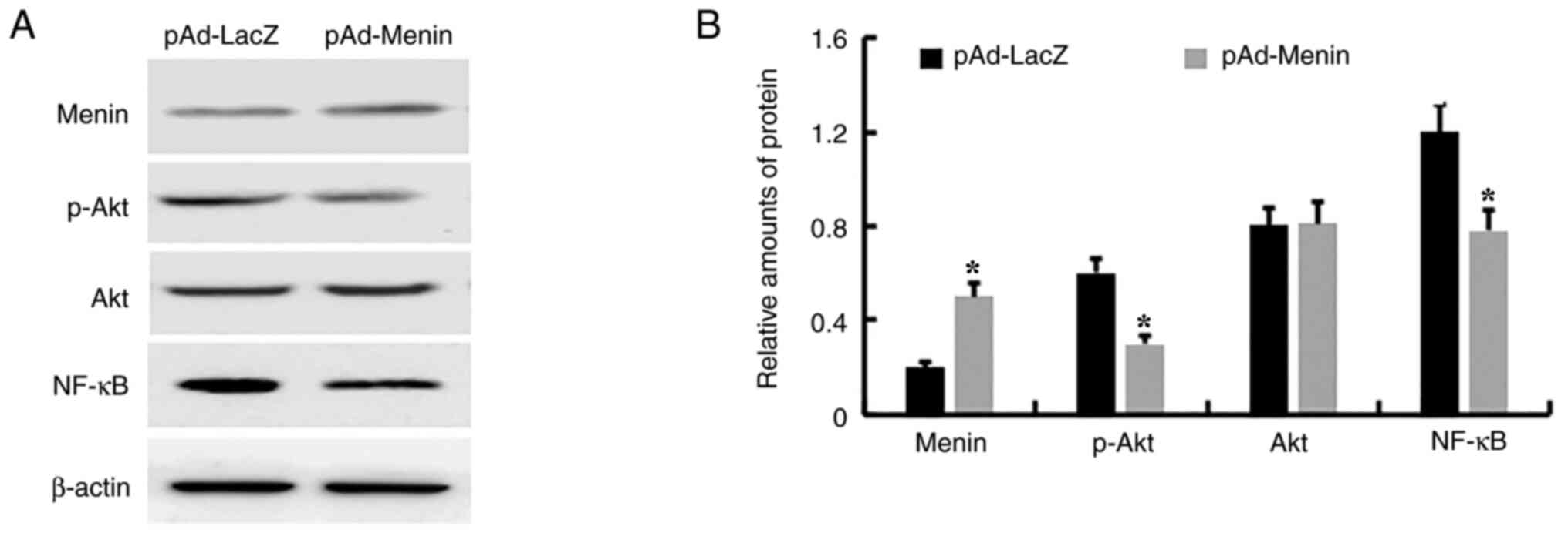 The adenoviral vectors pAd-LacZ (encoding β-galactosidase), pAd-IQGAP1 and pAd-Menin were kindly gifted by Dr Yong-Chang Chen (Jiangsu University, Zhenjiang, China). Mouse anti-menin antibody (EPR3986; product code ab92443) was obtained from Abcam, while mouse anti-IQGAP1 (cat. no. sc-376021), mouse anti-phosphorylated (p)-Akt (cat. no. sc-377556), mouse anti-Akt (cat. no. sc-5298), mouse anti-NF-κB (cat. no. sc-8414) and goat anti-β-actin antibodies (cat. no. sc-8432), as well as short-interfering RNAs (siRNAs) for IQGAP1 (5'-AAGTTCTACGGGAAGTAATTG-3') and menin (5'-CCACCUUUCUUGUGCAGUCCCUA-3'), and negative control siRNAs (RNA sequence, 5'-AUGAACGUGAAUUGCUCAA-3') were purchased from Santa Cruz Biotechnology, Inc. The horseradish peroxidase (HRP)-conjugated secondary antibody (cat. no. KCB002) was purchased from Rockland Immunochemicals Inc. Immunohistochemical and ECL reagents were acquired from EMD Millipore. All other reagents were of analytical grade.