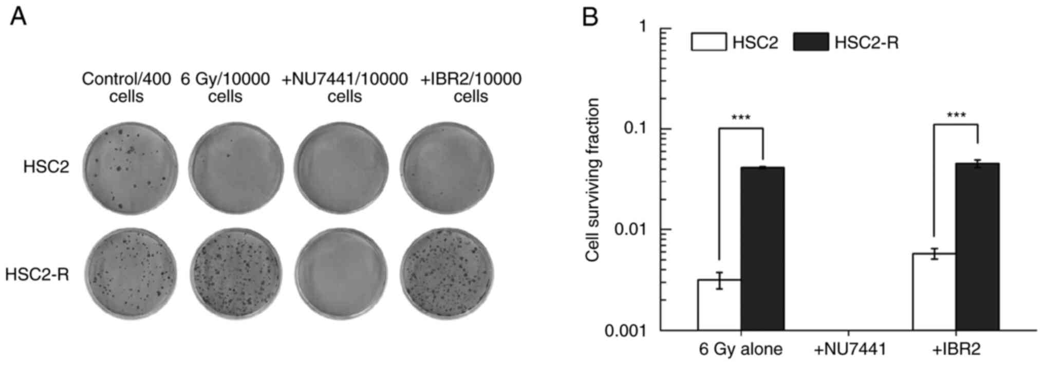 In the present study, the DDR of radioresistant HSC2-R cells and the non-radioresistant parental HSC2 cells was investigated using the DNA-PKcs inhibitor, NU7441, and Rad51 inhibitor, IBR2. DNA-PKcs is a major NHEJ protein, whereas Rad51 is a major HR protein (21,22). Both DNA repair mechanisms are important in radiation-induced lethal DSBs. In the present study, it was determined that radioresistant HSC2-R cells were more sensitive to both DNA repair inhibitors than non-radioresistant HSC2 cells, as indicated by the corresponding IC50 values (Fig. 1). In addition, the combination of NU7441 administration and 6 Gy irradiation eliminated colony formation in HSC2 and HSC2-R cells, whereas IBR2 administration with 6 Gy irradiation did not affect colony formation after 24 h of exposure. Because exposure to both inhibitors for >24 h completely eliminated colony formation, cell survival at other experimental time points was not feasible.