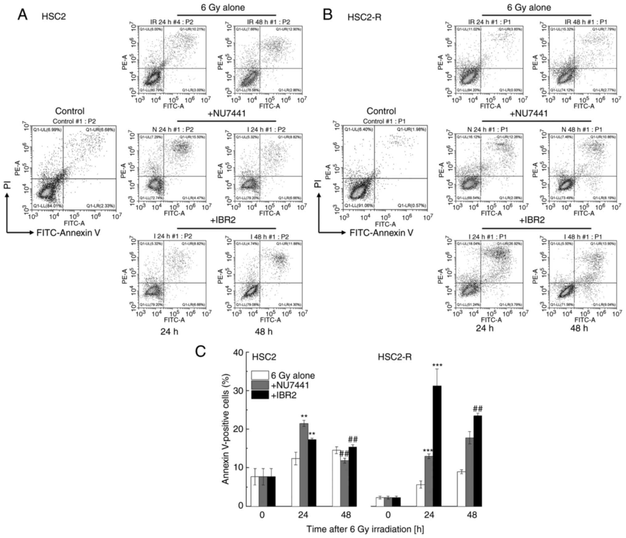 The percentage of apoptotic cells was assessed after 24 and 48 h of treatment using Annexin V and PI staining. Apoptotic cells were defined as Annexin V-positive cells [i.e., Annexin V (+)/PI (-) and Annexin V (+)/PI (+) fractions] (Fig. 3A and B). The percentage of apoptotic HSC2-R cells 24 h after treatment with 6 Gy irradiation alone was significantly lower than that of apoptotic HSC2 cells (5.66±0.93% vs. 12.38±1.64%, respectively) (Fig. 3C). At 48 h after 6 Gy irradiation, the percentage of apoptotic HSC2-R cells significantly increased compared to that at 24 h after treatment with irradiation (8.98±0.50%) but was lower than that of apoptotic HSC2 cells (14.55±0.88%). Following treatment with the combination of radiation and NU7441, the percentage of apoptotic HSC2 cells was significantly increased (21.52±0.76%) compared to that of HSC2-R cells (13.02±0.61%) at 24 h. At 48 h after treatment, the percentage of apoptotic HSC2 cells was then decreased (11.86±0.64%), and that of HSC2-R cells was further increased (17.77±1.61%). Meanwhile, IBR2 treatment for 24 h induced more apoptosis in HSC2-R cells (31.29±4.36%) than in HSC2 cells (17.32±0.37%), and then decreased at 48 h (15.35±0.59% for HSC2 cells; 23.48±0.67% for HSC2-R cells) (Fig. 3C). Although the radioresistant HSC2-R cells were apoptosis-resistant compared with HSC2 cells, both inhibitors significantly induced apoptosis at least at 24 h.