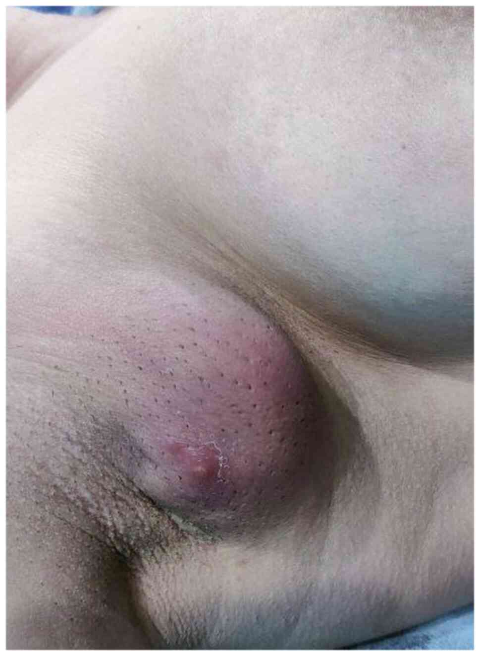 GM is often unilateral, with few reports of bilateral involvement. A large, tender lump, frequently several centimeters in diameter, is the most common presenting symptom. This is usually associated with skin abnormalities such as erythema and ulceration. Sinuses can occur, with discharge from the lesions. Multiple lumps and ulcers in one or more quadrants of the breast are common. Systemic features such as fever are uncommon (5,11). The current patient presented with right axillary pain and swelling for ~5 days, associated with fever and chills. On examination, there was a hard, palpable lump in the right axilla; it was tender and exhibited evidence of inflammation, such as redness and pain, as well as palpable axillary lymph nodes.