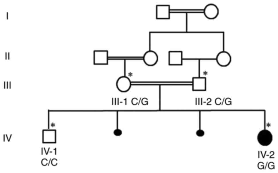 The family had a history of three generations of consanguine marriages. The grandparents and parents were first cousins. Whole exome sequencing (WES) was performed for the affected proband at the age of 6 months. No previous history of the disease was reported in the other family members.