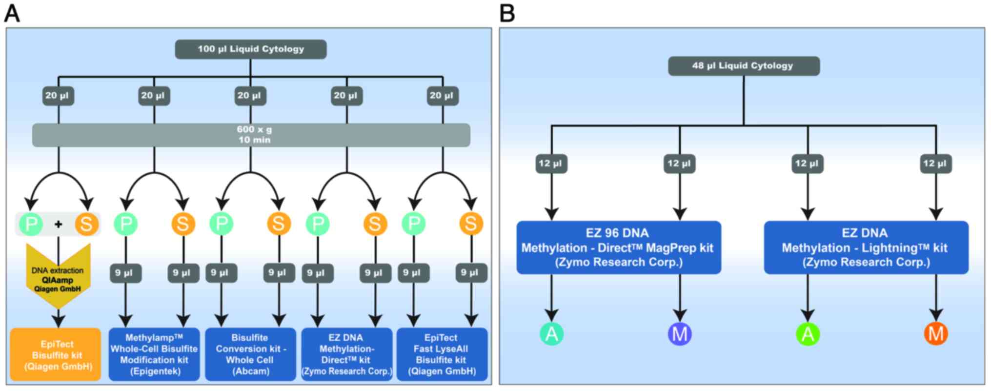 Rausch S, Hasinger O, Konig T, Schlegel A and Weiss G: An automated high throughput solution for DNA extraction and bisulfite-conversion from high volume liquid biopsy specimens: Sample preparation for epigenetic analysis. BMC Res Notes. 12(551)2019.PubMed/NCBI View Article : Google Scholar | |