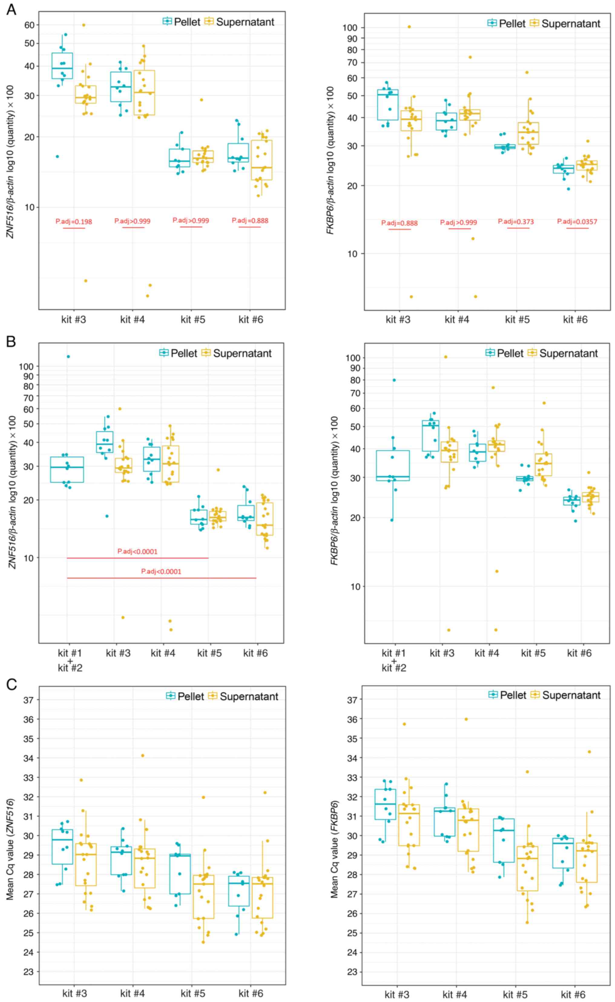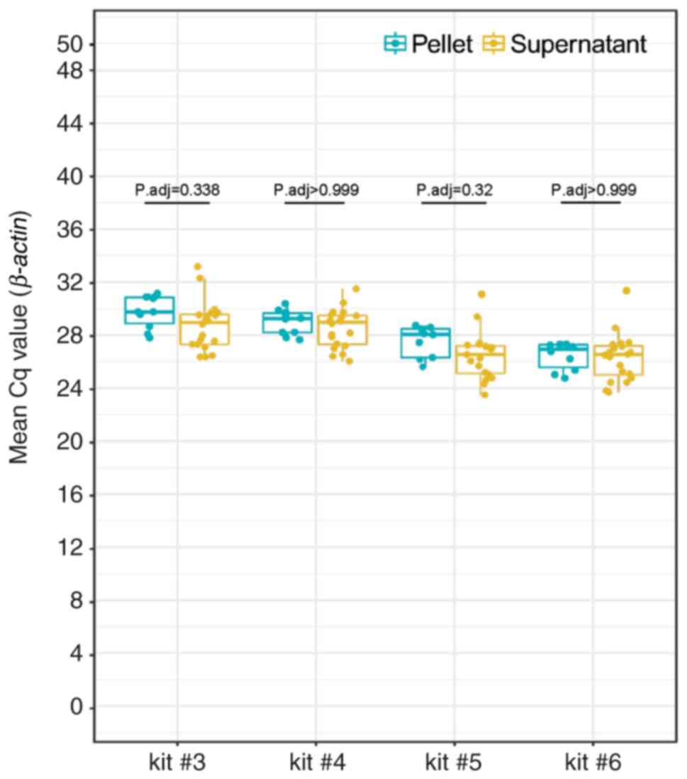 Summary statistics and interquartile range (IQR) of β-actin Cq values are listed in Table SIII. There was no significant difference in β-actin mean Cq values between pellet (n=10) and supernatant (n=20; Fig. 2). There was no significant difference in mean Cq values for pellets when comparing kits #5 and #6. However, mean Cq values for pellets were significantly higher for kits #4 and #3 compared with #6. There was no statistical difference in mean Cq values for supernatant samples between kits #5 and #6. Nevertheless, mean Cq values for supernatant were significantly higher for kits #4 and #3 compared with #6 (Figs. S1 and S2).