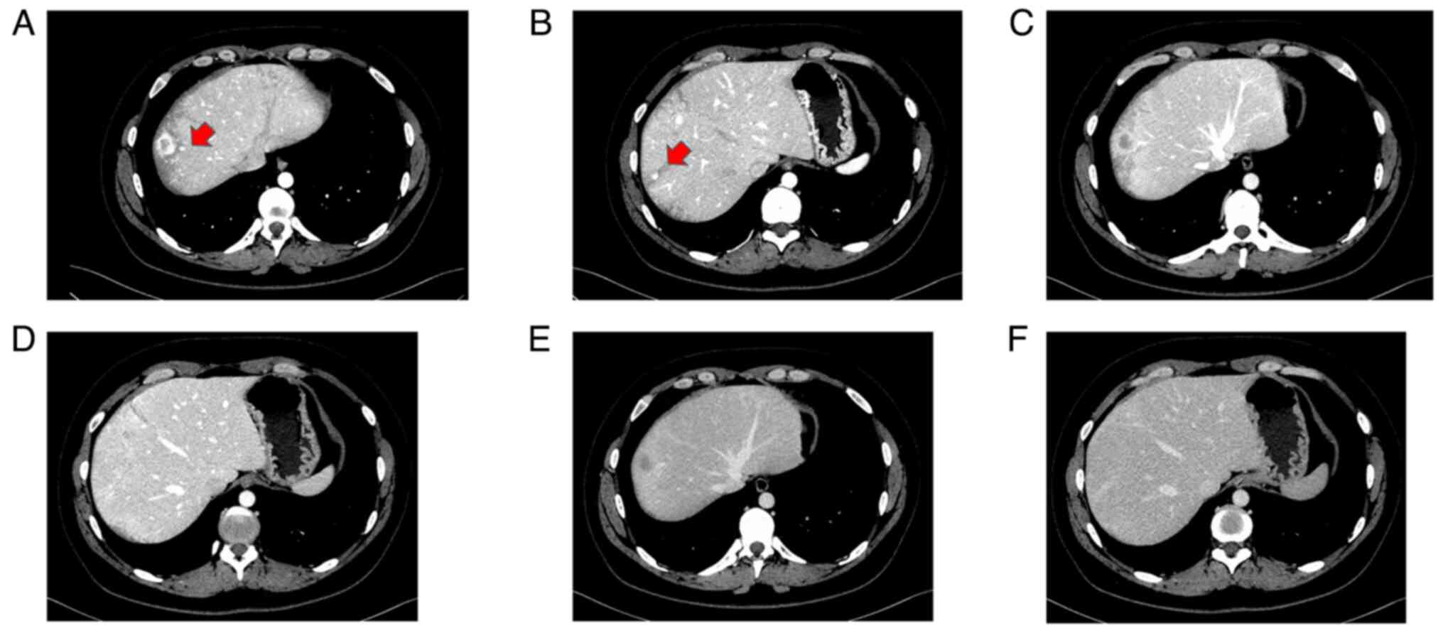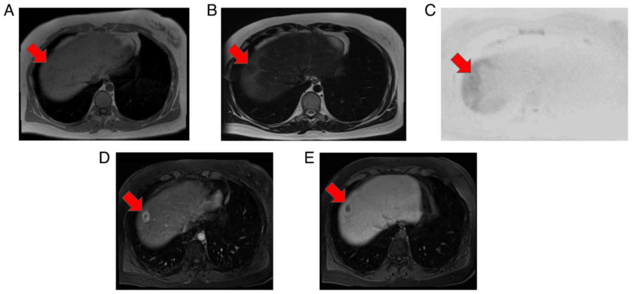 Hepatic PEComas typically show low signal intensity on T1-weighted MRI and high signal intensity on T2-weighted MRI (24); however, the present mass showed low signal intensity on both T1- and T2-weighted images, which was atypical, making preoperative diagnosis difficult. This also suggested a benign tumor, such as a hepatic hemangioma; nonetheless, the possibility of malignancy (such as metastatic liver tumor or HCC) could not be ruled out. Some studies have reported that outflow vessels of hepatic PEComas consist of the hepatic venous system, distinguishing them from HCC (25,26). In the present case, the primary tumor was contrast-enhanced in a ring shape in the early phase and washed out in the late phase; therefore, the possibility of malignancy could not be ruled out. As PEComa is associated with upregulation of the mTOR pathway, which regulates glucose transporter-1 function, fluorodeoxyglucose-positron emission tomography/CT findings would likely have been positive (27,28).