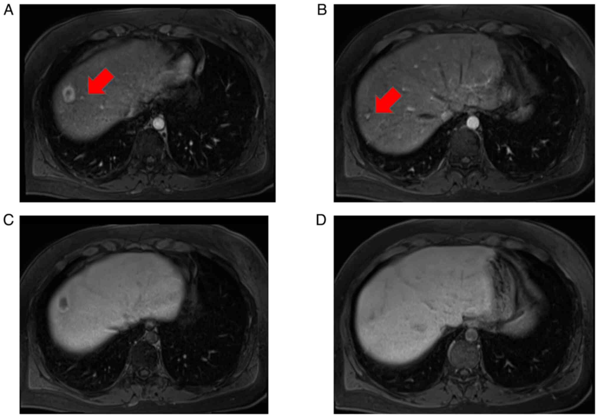 Ultrasonography revealed multiple hyperechoic tumors in the liver (Fig. 1A-C). Magnetic resonance imaging (MRI) was performed before a dynamic computed tomography (CT) scan to limit radiation exposure (8,12). MRI examinations were performed using 1.5-T MR systems (MAGNETOM Sola, Siemens Medical Solutions, Erlangen, Germany). The gradient strengths were 45mT/m with a slew rate of 200T/m/second. Eighteen-element phased array matrix coil was used for signal reception. MRI showed that the main tumor in segment (S)8 had low signal intensity on both T1- and T2-weighted images and slightly high signal intensity on diffusion-weighted imaging (Fig. 2A-C). Contrast-enhanced MRI revealed that the S8 tumor was enhanced in a ring shape during the early contrast phase (Fig. 2D). In the hepatobiliary phase, the periphery had a high signal intensity and the interior had a low signal intensity (Fig. 2E). Near the main tumor in S8, two small tumors were heavily contrasted in the early phase but were not identified in the hepatobiliary phase (Fig. 3). Numerous tumors suspected to be lipomas, focal nodular hyperplasia or arterio-portal shunts were also observed in the liver.