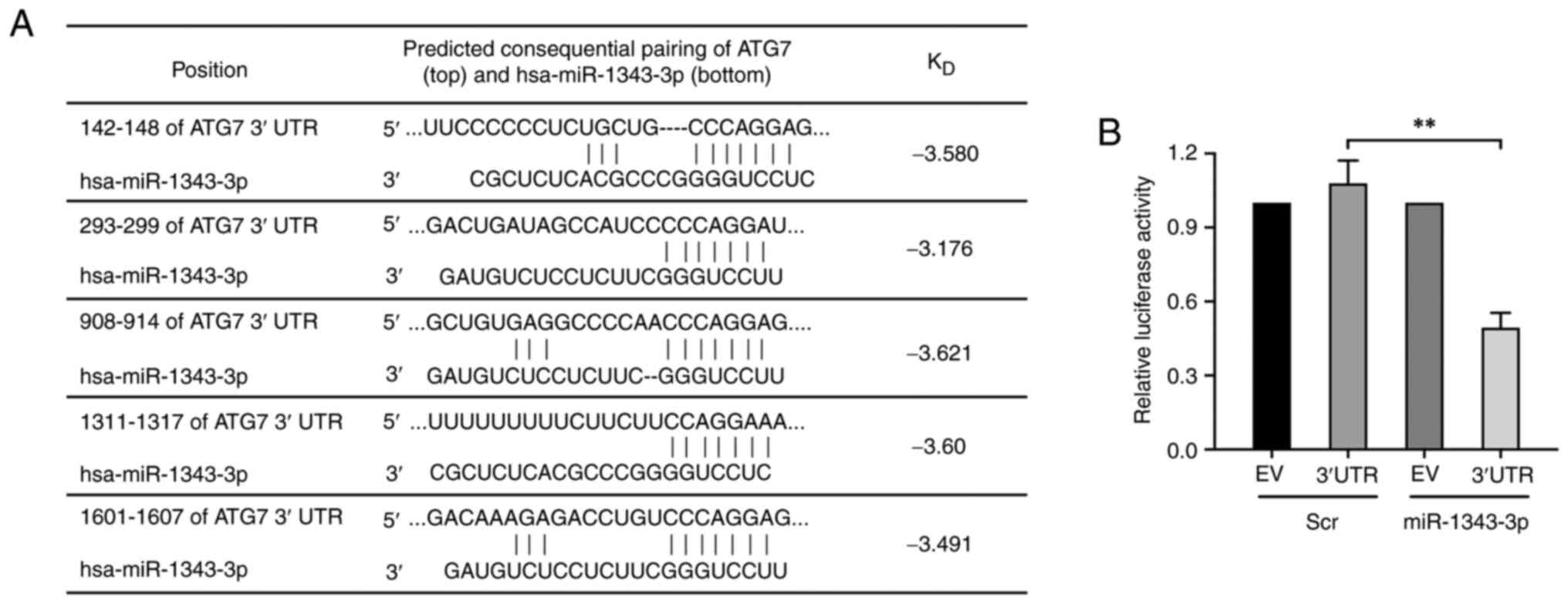 By contrast, miR-1343-3p inhibitor transfection significantly downregulated the mRNA levels of miR-1343-3p (Fig. 2B). Furthermore, RT-qPCR and western blot analysis confirmed that ATG7 protein levels were increased following knockdown of miR-1343-3p (Fig. 2B).