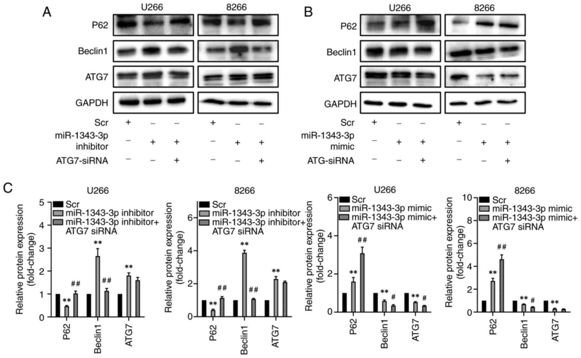 miR-1343-3p mimic, inhibitor and pre-miR-scrambled (Scr) were obtained from Shanghai GenePharma Co., Ltd. (Table I). miRNA mimic and inhibitor were transfected into 293T (China Center for Type Culture Collection), U266 and RPMI-8266 cells using Lipofectamine® 2000 reagent (Invitrogen; Thermo Fisher Scientific, Inc.) according to the manufacturer's protocol. The concentration of nucleic acids used for transfection was 50 nM. The transfection was conducted at room temperature for 20 min for the complex formation, and then cells were incubated at 37˚C in a 5% CO2 incubator. Following transfection, cells were incubated for 24-48 h before subsequent experimentation. Total RNA was extracted from cells using TRIzol™ (Invitrogen; Thermo Fisher Scientific, Inc.) and reverse-transcribed into cDNA using RT-PCR kit (Takara Bio, Inc.) according to the manufacturer's instructions. qPCR was performed employing a SYBR Green PCR Master Mix (Takara Bio, Inc.) and CFX96 Real-Time PCR Detection System (Bio-Rad Laboratories, Inc.). The relative mRNA levels of miR-1343-3p and ATG7 were evaluated using GAPDH as an internal reference, according to the Livak method. The primers were purchased from Sangon Biotech Company Co., Ltd. (Table II). qPCR was performed using the following thermocycling conditions: Initial denaturation at 95˚C for 10 min, followed by 40 cycles of denaturation at 95˚C for 15 sec, annealing/extension at 60˚C for 60 sec. The relative expression levels of miR-1343-3p and ATG7 were quantified using the 2^-ΔΔCq method (20).