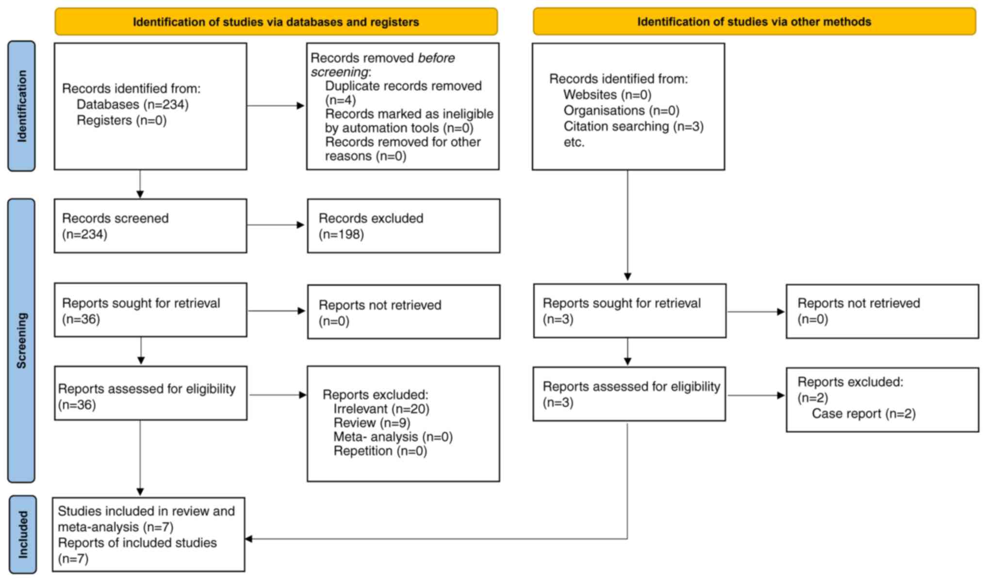 Furthermore, 29 other papers were excluded for failing to disclose pertinent data. Thus, six studies fulfilled the inclusion and not the exclusion criteria (11-14,20,21). Another study was identified in a manual search and added (22). Hence, seven studies were included in this meta-analysis. Only one study was a randomized clinical trial (RCT) (14), while the remaining studies were retrospective cohort studies. A total of 254 patients were included in the present meta-analysis. The literature review process is depicted in Fig. 1. Table I presents the characteristics of the included studies.