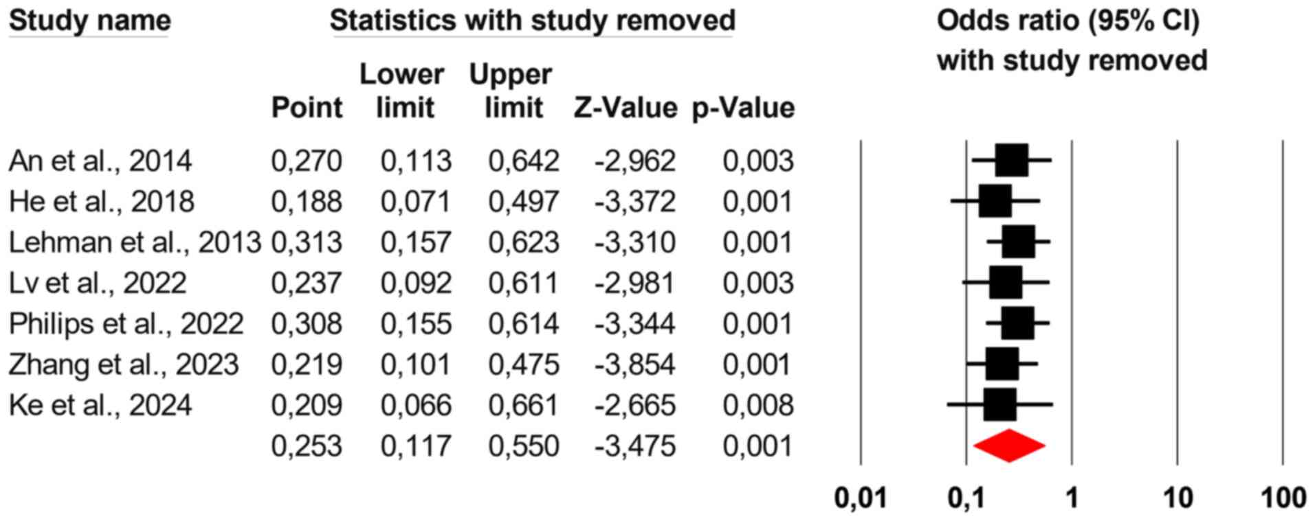 Leave-one-out sensitivity analysis is a robust technique used in meta-analysis to evaluate the influence of individual studies on the overall effect size. This method systematically excludes one study at a time from the analysis and recalculates the overall effect size and heterogeneity for each iteration. By doing so, it is identified whether any single study disproportionately affects the results. Significant changes in the effect size or a marked decrease in heterogeneity upon exclusion indicate that the omitted study may be an influential outlier (19). P<0.05 was utilized as the threshold for statistical significance.