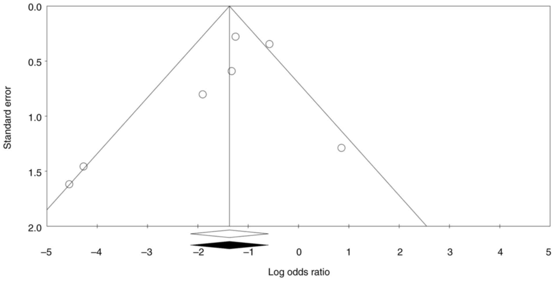 The data were analyzed using the Comprehensive Meta-Analysis Software program, version 2.0 (Biostat). Dichotomous factors were compared using odds ratios (OR). 95% confidence intervals (CI) were provided for each reported outcome. The pooled OR and 95% CI were estimated using the Mantel-Haenszel method for dichotomous data. Data heterogeneity was evaluated using the I2 test and was deemed high if I2 was >50%. The random-effects model was used to analyze the data due to their high heterogeneity (I2>50%). Random-effects models are advantageous when there is significant heterogeneity across studies, as they provide a more realistic and generalizable estimate of the overall effect size while accounting for the variability in the underlying true effects (17). Trim and fill, Begg's analysis Egger's regression, and funnel plot were employed to evaluate publication bias in this body of literature. A funnel plot visually represents the effect sizes of individual studies against their precision, ideally forming a symmetrical shape; asymmetry suggests potential bias, often due to smaller studies with non-significant results being unpublished. The trim-and-fill method addresses this issue by first trimming away studies that contribute to asymmetry and then filling in hypothetical missing studies to restore symmetry, thereby providing an adjusted overall effect estimate. Furthermore, Egger's regression test assesses funnel plot asymmetry by performing a weighted regression of the effect sizes on their standard errors. A significant intercept in this regression indicates potential publication bias, suggesting that smaller studies with non-significant results are missing from the analysis. Conversely, Begg's analysis, specifically the Begg and Mazumdar rank correlation test, evaluates the correlation between the ranks of effect sizes and their variances. A significant correlation suggests that smaller studies report different results than larger ones, which can also indicate publication bias (18).