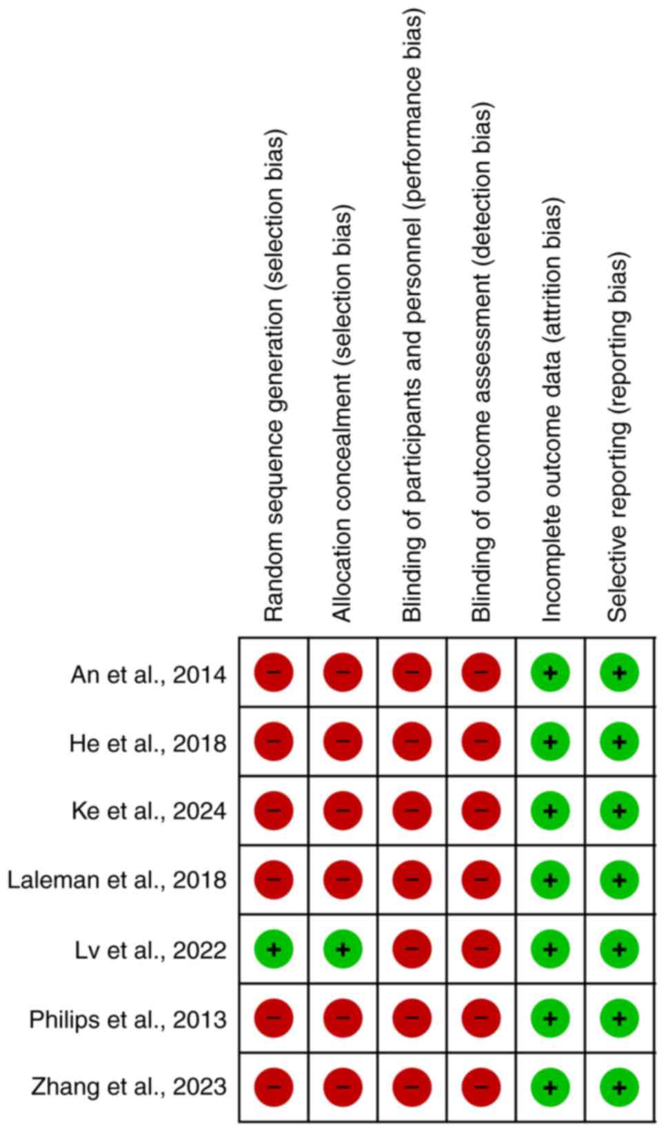 Begg's and Egger's tests are statistical methods that help determine whether the results of studies are systematically skewed due to selective publication (23). Begg's test (P=0.229), Egger's test (P=0.273), and the funnel plot showed no significant risk of publication bias (Fig. 4). Quality appraisal showed that all included studies were of low quality, except the study by Lv et al (14), in which the patients were randomized into two groups of intervention and control (Fig. 5).