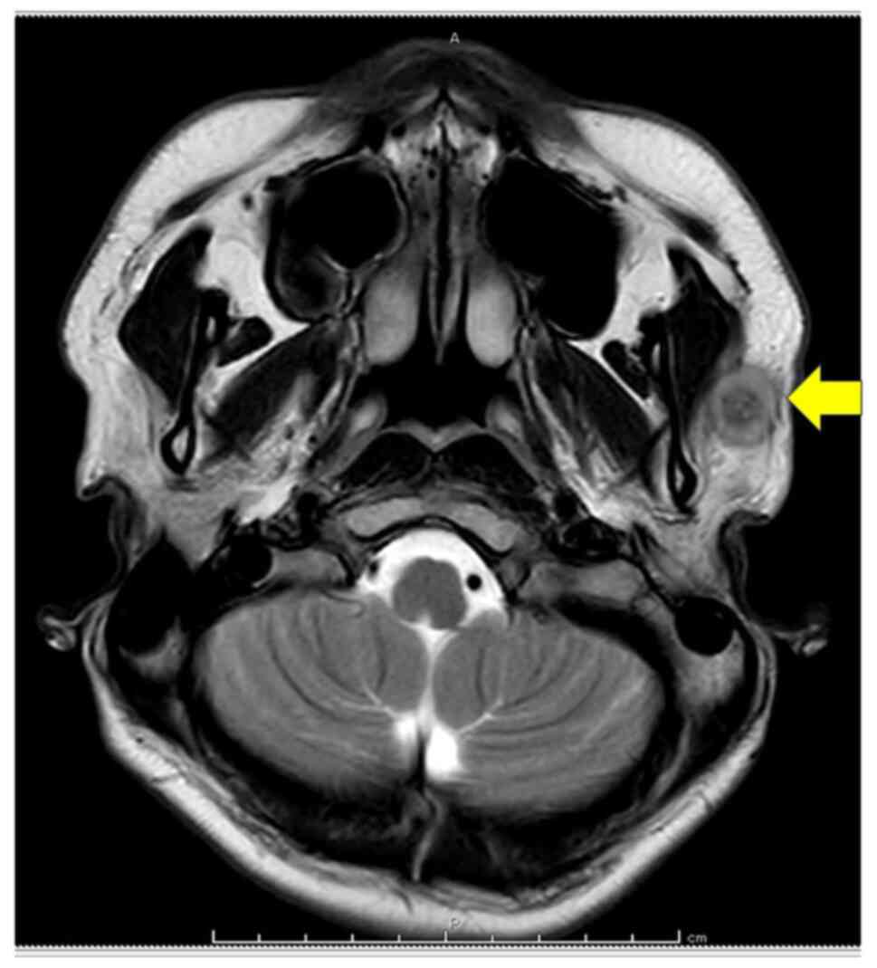 A 25-year-old male patient presented to Osaka Medical and Pharmaceutical University Hospital (Osaka, Japan) in June 2023 with symptoms of pain and firm left preauricular nodules that had persisted for six months. Magnetic resonance imaging of the neck showed a mass in the lower portion of the left parotid gland (Fig. 1). Following superficial parotidectomy and radiotherapy, no medication was administered and semiannual follow-up was continued. The patient has remained asymptomatic for one year and three months.