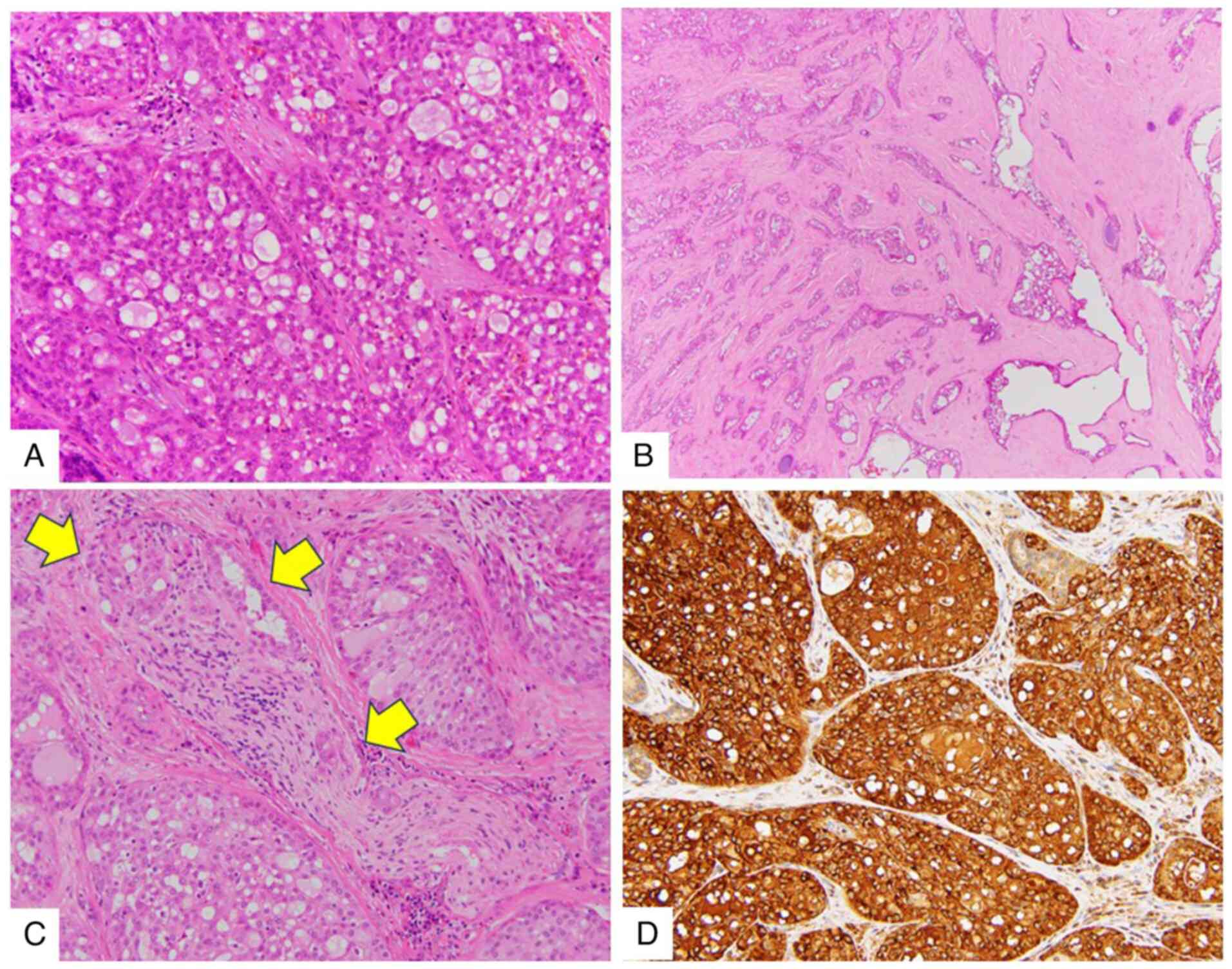 Macroscopic examination showed a firm, solid tumor measuring 1.8 cm, which was ill-defined and without encapsulation. The tissue was fixed in 10% neutral buffered formalin overnight at room temperature (RT) and embedded in paraffin wax for H&E and immunohistochemical staining. Sections of 4 µm thickness from the paraffin block were dewaxed and rehydrated, and they were stained with hematoxylin for 5 min and eosin for 1 min at RT. The stained sections were examined under a light microscope (BX53; Olympus Corp.). Histological analysis showed a lobulated growth pattern, characterized by microcystic and follicular structures with colloid-like secretions. In addition, eosinophilic and occasionally vacuolated cytoplasm were observed (Fig. 2A). Nuclei were oval to round with a single nucleolus, demonstrating mild pleomorphism. There was no evidence of mitotic figures or necrosis. Central tumor regions showed macrocystic and trabecular structures in a prominent hyalinized sclerotic stroma (Fig. 2B). Tumor infiltration extended into surrounding connective tissue, muscle and nerve (Fig. 2C). For immunohistochemical analysis, an automated immunostaining device, the VENTANA BenchMark ULTRA (Roche Tissue Diagnostics) was used, and the procedures including antigen retrieval, blocking, washing and detection using secondary antibodies followed the manufacturer's instructions. In brief, before staining, to block endogenous peroxidases, the immunohistochemistry device-dedicated reagent (UltraView DAB Universal; Roche Tissue Diagnostics) was used. In the deparaffinization process, EZ prep (Roche Tissue Diagnostics) was used. The stained sections were observed under a light microscope (BX53; Olympus Corp.). Immunohistochemistry showed that tumor cells were positive for S100 protein (cat. no. 518-110109) (Fig. S1A), mammaglobin (cat. no. 518-111380) (Fig. 2D) and GATA binding protein 3 (cat. no. 518-111953) (Fig. S1B). The tumor cells were negative for DOG1 (cat. no. 518-110789). The Ki-67 (cat. no. 518-102456) labelling index was maximally 8% (Fig. S1C). All antibodies were from Roche Tissue Diagnostics and prediluted.