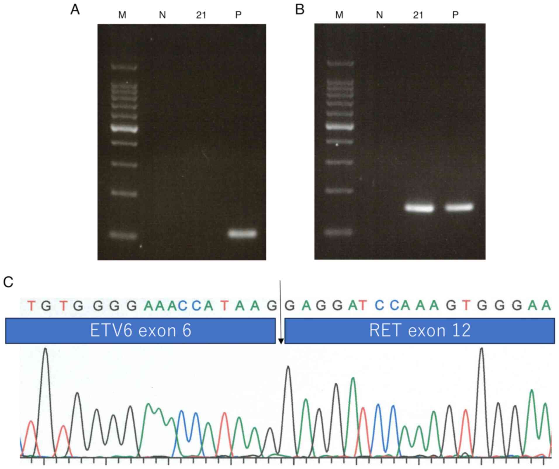 Reverse transcription (RT)-PCR was performed using paraffin-embedded tissue. Total RNA was extracted and the cDNA samples were then subjected to PCR as previously described (1,3). The primer sequences are shown in Table I. The RT-PCR results demonstrated the presence of ETV6::RET fusion and the absence of an ETV6::NTRK3 fusion (Fig. 3A and B). The ETV6::RET fusion was confirmed following direct sequencing of the PCR fragment using a Big Dye Terminator Sequence kit (Applied Biosystems; Thermo Fisher Scientific, Inc.) (Fig. 3C). The analysis was performed according to the manufacturer's instructions.