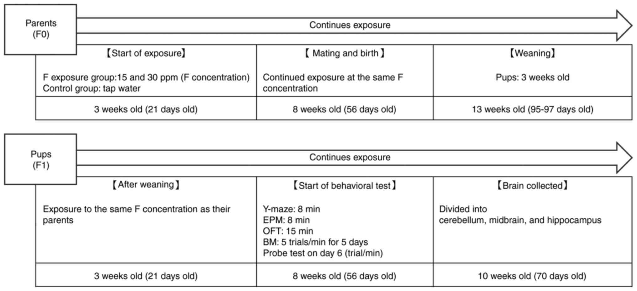 Male and female 21-day-old ICR mice (F0) were purchased from Sankyo Laboratory Services, Inc. They were housed in an air-conditioned room under a 12/12-h light/dark cycle (lights off at 20:00; rearing temperature at 24˚C), with males and females under standard rearing conditions, three per cage. Information on the F0 mice is shown in Table I. The purchased mice were randomly allocated to a control group consuming tap water and sodium fluoride (Nacalai Tesque, Inc.) exposure groups consuming 15 mg F ions/l (15 ppm) or 30 mg F ions/l (30 ppm). The sodium fluoride was dissolved in ultrapure water (Organo Corp.). Female and male F0 mice were exposed to the sodium fluoride-containing drinking water from 3 weeks of age. F0 mice were mated at 8 weeks-old and continued to consume tap water or water containing sodium fluoride during pregnancy and until weaning on postnatal day 21. After weaning, the pups (F1 mice) were exposed to the same concentrations of F as F0 through their drinking water. In the present study, behavioral testing and brain analysis were performed exclusively on male F1 offspring. Only male F1 mice were included in the analysis because the prevalence of ASD in males is higher than in females (22). Behavioral tests began at 8 weeks of age to assess neurodevelopmental effects and concluded by 10 weeks. After testing, the F1 mice were euthanized, and their brains were collected. Neurotransmitter concentrations in the cerebellum, midbrain and hippocampus were measured using liquid chromatography-tandem mass spectrometry (LC/MS/MS). Exposure to sodium fluoride continued for the F1 mice until euthanasia. This choice is in line with the research content, which focuses on the neurodevelopmental consequences associated with ASD. The experimental protocol was approved by the Juntendo University Center for Biomedical Resources (approval no. 1231; Tokyo, Japan). The experimental procedure, including sodium fluoride exposure, behavioral testing, and euthanasia/brain collection, for the F0 and F1 mice is shown in Fig. 1.