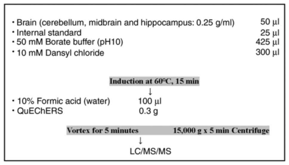 Iwasaki Y, Matsumoto H, Okumura M, Inoue H, Kaji Y, Ando C and Kamei J: Determination of neurotransmitters in mouse brain using miniaturized and tableted QuEChERS for the sample preparation. J Pharm Biomed Anal. 217(114809)2022.PubMed/NCBI View Article : Google Scholar | |