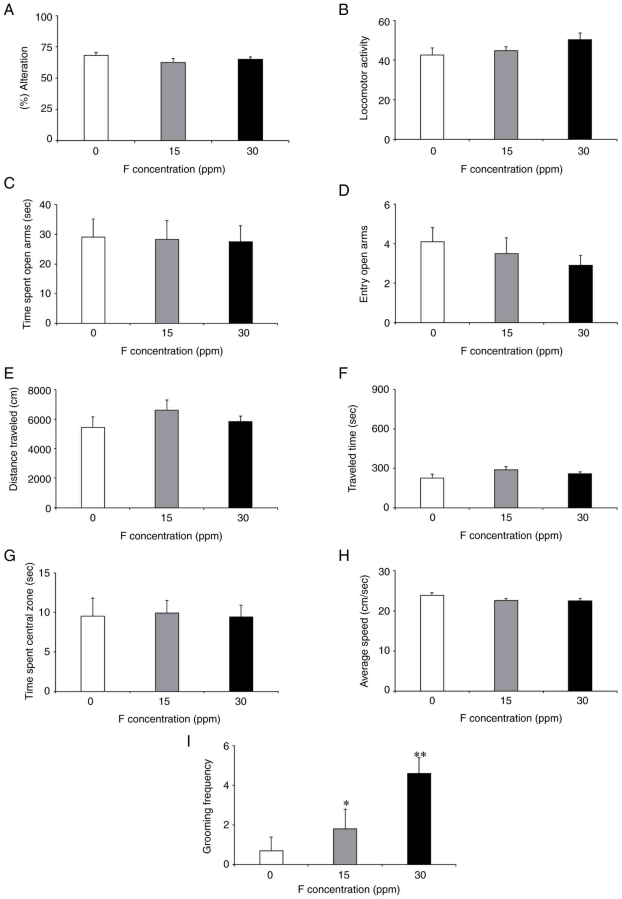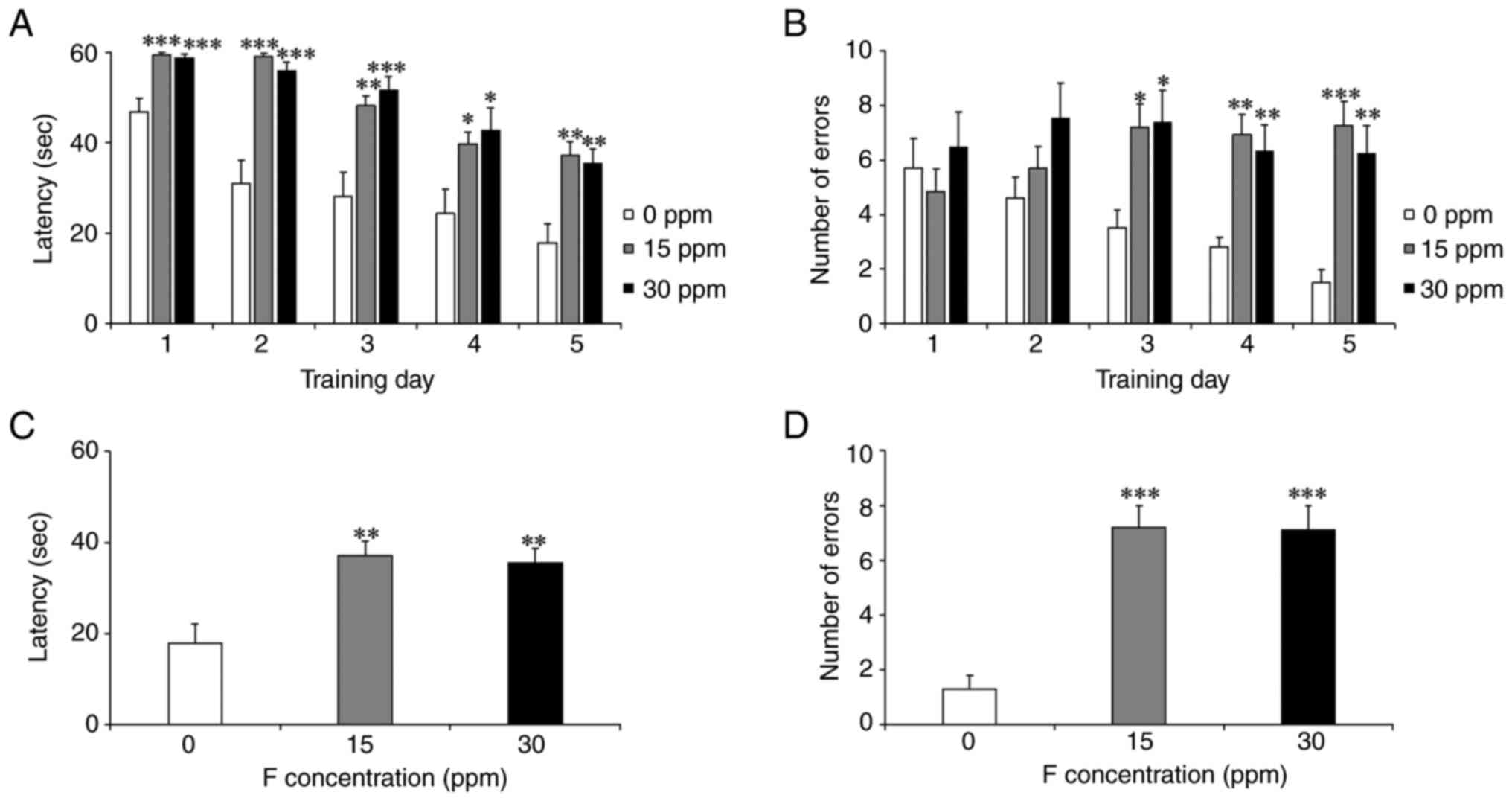 Data confirmed normal distribution (P<0.05). The Y-maze, EPM and OFT results are shown in Fig. 3A-I. There were no significant differences between the F-exposure and control groups in the Y-maze (Fig. 3A and B) or in the EPM (Fig. 3C and D). In the OFT, there were significantly higher grooming frequencies in the 15 and 30-ppm groups than in the control group (Fig. 3I). However, there were no significant differences in the other parameters associated with the OFT (Fig. 3E-H). The results of the BM analysis are shown in Fig. 4A-D. During the 5-day training period, the 15 and 30-ppm groups showed significantly longer latencies and more errors than the control group (Fig. 4A and B). In the test, the 15 and 30-ppm groups also exhibited significantly longer latencies and more errors (Fig. 4C and D).