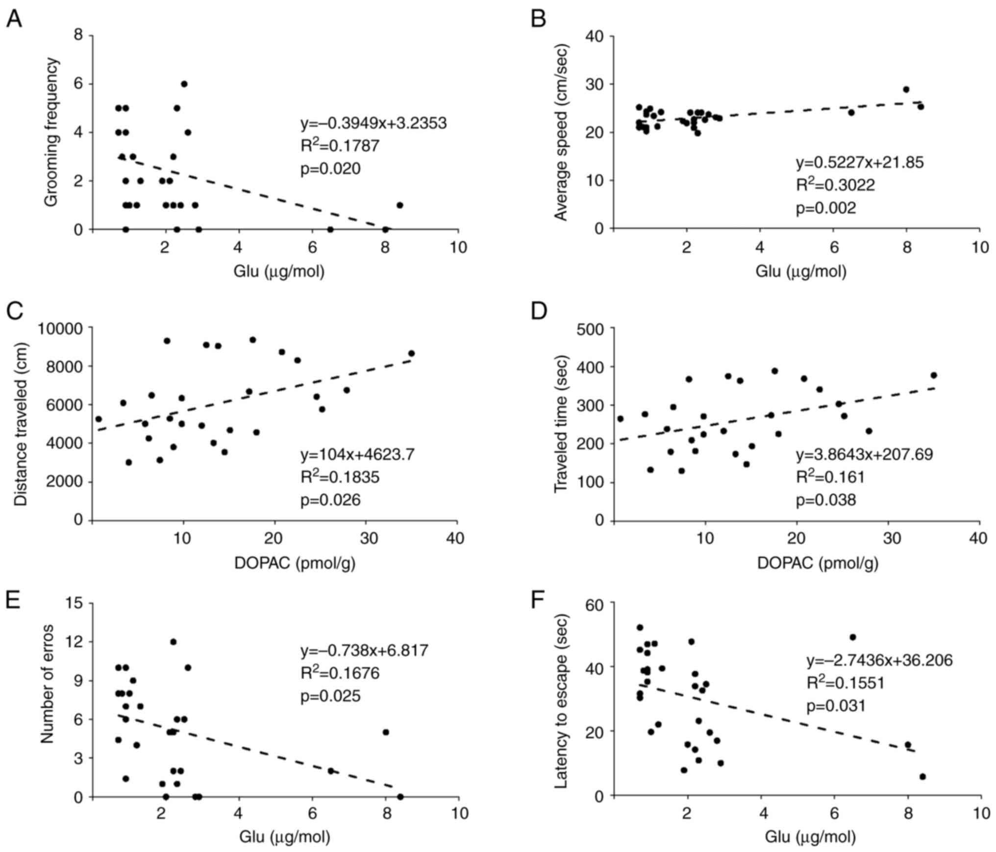 Although the mechanisms of ASD are not fully understood, human studies have reported decrease in the neurotransmitters 5-HT, DA (24), Glu and GABA (25). In addition, it has been reported that the effects of sodium fluoride exposure on the behavior of experimental animals and humans include a decrease in cognitive function (26,27), anxiety-like and depressive behavior (28). If ASD-like behavior is being observed, it was considered that it might be related to neurotransmitters; thus the relationship between the two was calculated. The characteristics of ASD include delayed social interaction, communication and repetitive behaviors. In addition, it has been reported that the levels of the following neurotransmitters in the brain are decreased with ASD: 5-HT (abnormal control of emotions and social behavior), Glu (excitatory neurotransmitter) (24), GABA (inhibitory neurotransmitter) and DA (abnormal reward processing) (25). If F-exposure is a factor in the development of ASD, it was considered that there may be abnormalities in neurotransmitters related to behavior, therefore both behavior and neurotransmitters were analyzed. Therefore, the effects of sodium fluoride exposure on behavior and neurotransmitters were investigated using experimental animals during the fetal period. As a result, it was found that exposure to sodium fluoride affects behavior tests and neurotransmitters in the brain. Neurotransmitters are chemicals that transmit information in the brain, and are therefore involved in a variety of behaviors. The identification of the effects of sodium fluoride exposure on behavior (for example, memory, learning, anxiety-like behavior) and levels of neurotransmitters provoked us to perform correlation analysis to determine the extent to which these parameters were related. The correlations between the levels of cerebellar neurotransmitters and behavioral test outcomes are demonstrated in Fig. 5. There was a negative correlation between grooming frequency in the OFT and the Glu concentration (Fig. 5A). There were also positive correlations between the mean speed and the Glu concentration (Fig. 5B); the distance traveled (Fig. 5C) and the traveling time (Fig. 5D) during the OFT with the DOPAC concentration. For the BM, there were significant negative correlations of the number of errors (Fig. 5E) and the latency (Fig. 5F) with the Glu concentration. The correlations between the levels of neurotransmitters in the midbrain and the behavioral test outcomes are shown in Fig. 6. In the OFT, there were significant positive correlations of mean speed with the NA (Fig. 6A) and DOPAC (Fig. 6B) concentrations. In the BM, there was a negative correlation between the number of errors and the NA concentration (Fig. 6C). The correlations between the levels of hippocampal neurotransmitters and the behavioral test outcomes are shown in Fig. 7. In the Y-maze, there was a positive correlation between the 5-HT concentration and locomotor activity (Fig. 7A). In addition, in the OFT, there was a positive correlation between the NA concentration and average speed (Fig. 7B).