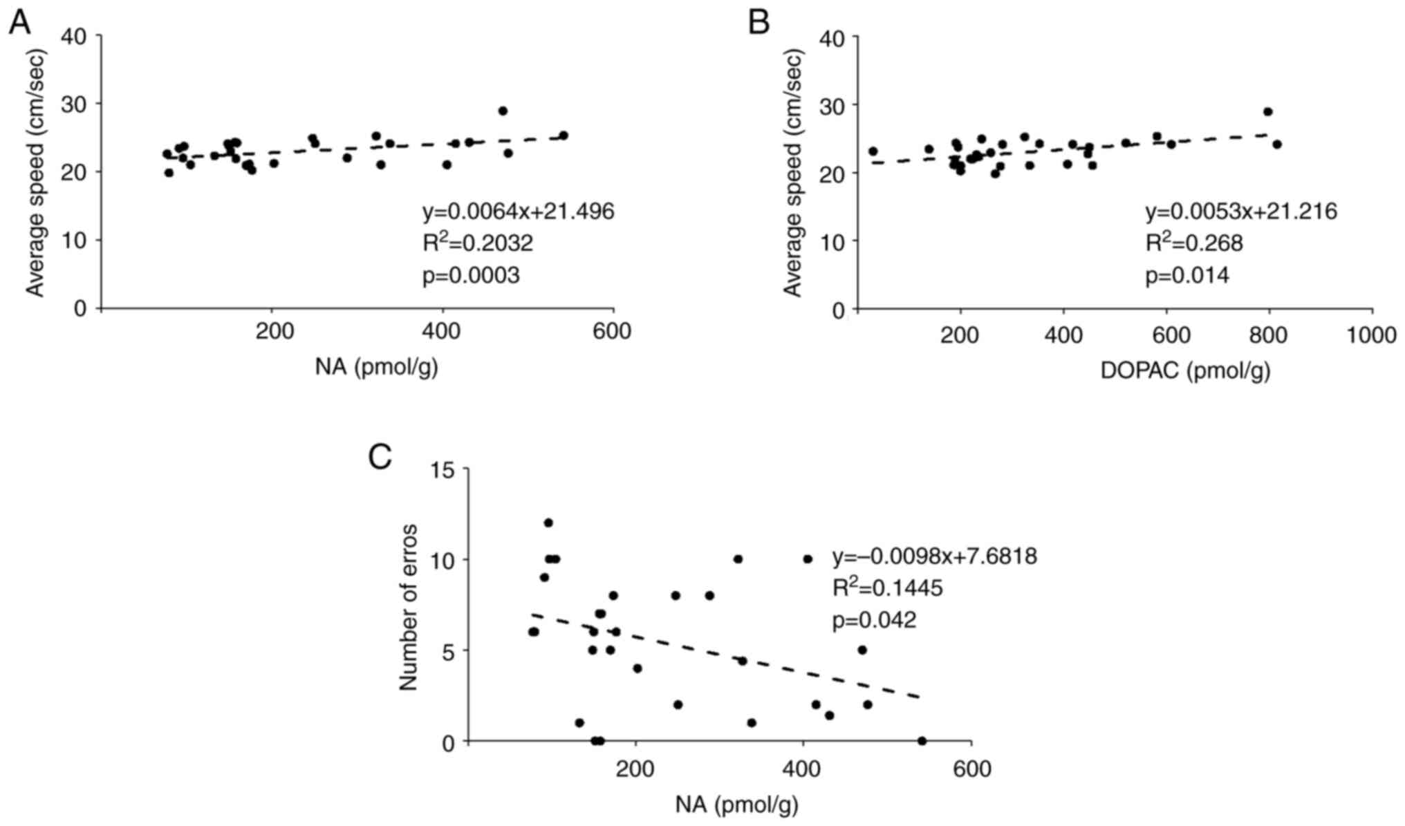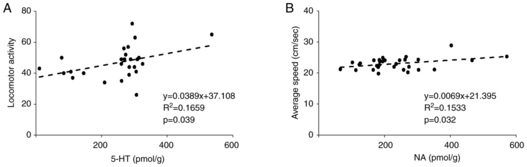 It was found that low concentrations of NE and DOPAC in the midbrain were associated with poorer motor function (Fig. 6A and B). It has previously been reported that low NE and DA concentrations in the midbrain, as well as low concentrations of their metabolites, such as DOPAC, are associated with poorer locomotor activity (44). Furthermore, low NA concentrations in the midbrain have been shown to be associated with a larger number of errors in the BM (Fig. 6C). Furthermore, low NA concentrations in the midbrain, and particularly in the locus coeruleus (LC), are associated with impaired memory and cognitive function (45). The LC is the main source of norepinephrine in the brain and plays an important role in the regulation of various cognitive processes (46,47). In the present study, the correlations obtained between locomotor activity and levels of neurotransmitter concentrations suggested that poor locomotor activity may be the result of low concentrations of 5-HT and NA (Fig. 7A and B). This suggests that the concentrations of 5-HT and NA, which are involved in emotion and cognitive function, may also contribute to motor control. The effects of 5-HT on emotion and cognitive function have been widely reported, and it is considered that these may also affect locomotor activity (48,49). NA has been reported to promote neurogenesis and synaptic plasticity in the hippocampus (50,51), and there have also been reports that hippocampal neurogenesis is related to motor learning (52). Thus, the present results suggest that low hippocampal concentrations of 5-HT and NA may indirectly affect locomotor activity via cognition and emotion. Correlation analysis of the relationships between the levels of neurotransmitters and behavioral data generated relatively weak correlations (the R² values were mostly <0.3). For correlation coefficients <0.3, the statement ‘a trend was indicated’ is used because it is a weak correlation. Indeed, a single neurotransmitter does not determine behavior, but instead interacts with other neurotransmitters, hormones, environmental factors, learning experiences and genetics to function in this way (53). Individual differences, environmental conditions, technical errors in the measurement of behavioral parameters, and the levels of neurotransmitters may have weakened these correlations (54). In the future, it will be necessary to construct more precise models and evaluate the interactions between neurotransmitters and behavior, considering multiple variables. In addition, the current research results showed that chronic exposure of the fetus to sodium fluoride caused weight loss after weaning. In a study in which pregnant rats were exposed to F, it was reported that F passed through the placental barrier and accumulated in the amniotic fluid and fetal plasma, that the osmotic pressure of the amniotic fluid decreased on day 20 of gestation, and that the rate of delayed fetal development was high in F0 fetuses (55). It has been suggested that F1s after weaning may decrease in weight because of F exposure to fetal development (55). However, the mechanism remains unknown.