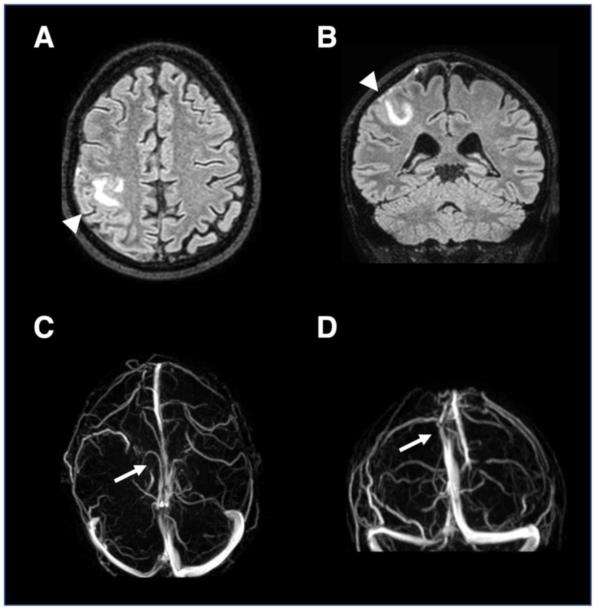 A diagnosis of MOGAD was made according to the International MOGAD Panel criteria (1), based on a core clinical demyelinating event (myelitis) with supporting MRI features of LETM, positive MOG-IgG antibodies and seronegative AQP4-IgG, after excluding alternative diagnoses. The patient underwent high-dose intravenous methylprednisolone therapy (1,000 mg per day for 5 days), followed by oral prednisone (50 mg daily). The patient fully recovered and was discharged after 10 days with a prescribed tapering of prednisone over 1 month. However, at 3 days post-discharge, the patient returned to the Emergency Department of ‘Bianchi-Melacrino-Morelli’ Hospital due to a focal to bilateral epileptic seizure, preceded by 2 days of continuous right frontotemporal headaches. Neurological examination revealed mild left hemiparesis and drowsiness, with a National Institutes of Health Stroke Scale (NIHSS) score of 4(7). An urgent brain computed tomography scan showed a right cortical parietal hypodense lesion. Brain MRI revealed a fluid-attenuated inversion recovery-hyperintense right frontoparietal lesion, and an MRI angiogram showed absence of flow in the right superficial cortical veins and superior sagittal sinus, confirming CVT (Fig. 2).