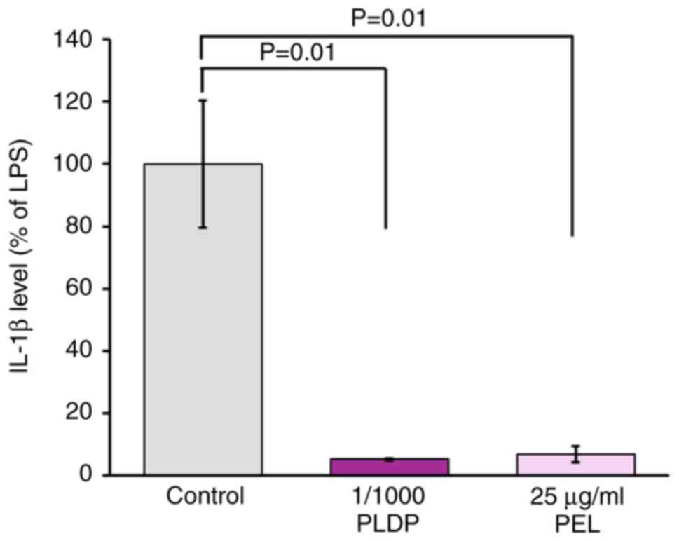 IL-1β production induced by LPS stimulation was inhibited by ~95% when PLDP was diluted 1,000-fold from the original solution. Similarly, IL-1β production induced by LPS stimulation was inhibited by ~93% when PEL was used at a concentration of 25 µg/ml (Fig. 1).