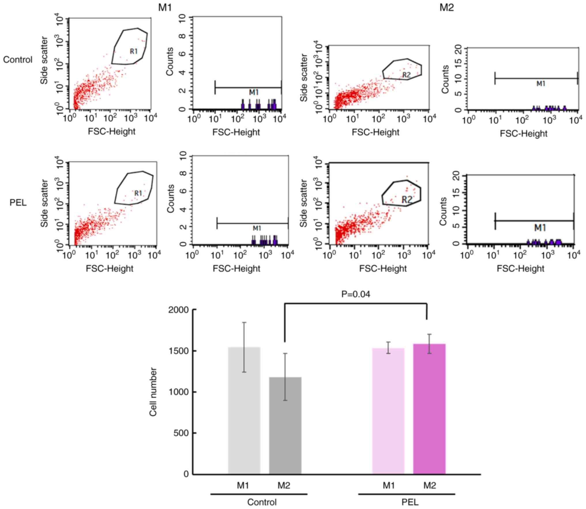Antibodies used for flow cytometry included monoclonal antibodies CD86 (1:100; cat. no. 11-0862-81) and CD16/CD32 (1:100; cat. no. 14-0161-82), both purchased from Abcam; and CD206 (1:100; cat. no. 141705), purchased from BioLegend, Inc. Raw 264.7 cells (1x106 cells) were treated for 48 h with PEL (25 µg/ml) + LPS (100 ng/ml) or only LPS (100 ng/ml) and then immuno-stained at 4˚C for overnight for flow cytometric analysis. Briefly, the cells were collected, and the Fc receptors were blocked for 20 min on ice using the CD16/CD32 monoclonal antibody. This was followed by incubation with the CD86 monoclonal antibody at room temperature to label the M1 macrophages. After washing, the CD206 monoclonal antibody was added for labeling M2 macrophages. Following the staining, the samples were evaluated using a BD FACSCalibur flow cytometer (BD Biosciences). The data was analyzed using the BD CellQuest Pro software (part no. 349226; Rev A July 2002; BD Biosciences).