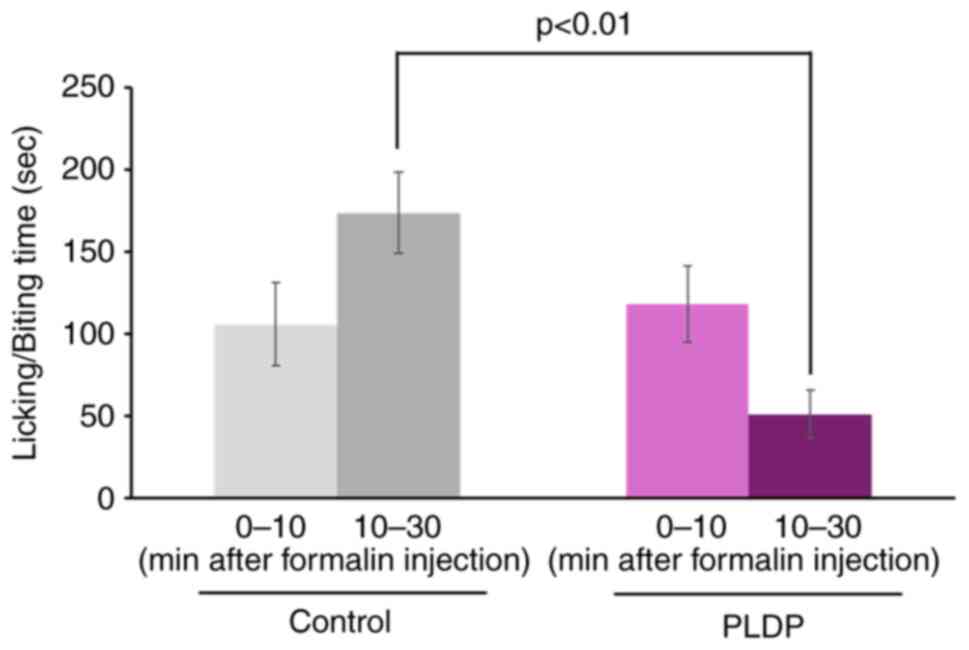 Inflammation pain models, including the formalin-induced inflammation model, evaluate pain and analgesia by administering chemicals that stimulate peripheral nerves to induce inflammation and are broadly considered neuropathic pain models. In the present study, the formalin induced inflammation model was performed according to the method described by Tan-No et al (14). Prior to the experiment, mice were individually placed in transparent plastic cages (22.0x15.0x12.5 cm) to enable observation and allowed to acclimate to the environment for ~1 h. PLDP or distilled water (Otsuka Pharmaceutical Factory) was orally administered (0.2 ml/mouse, n=7) 30 min before injection of 20 µl of 2% formalin (Fujifilm Wako Pure Chemical Industries) into the hind footpad of the mice. The formalin was diluted with saline (Otsuka Pharmaceutical Factory). Behavioral observations were performed for 30 min after formalin administration. The antinociceptive effect of PLDP was evaluated based on observed pain-related behaviors (licking and biting).