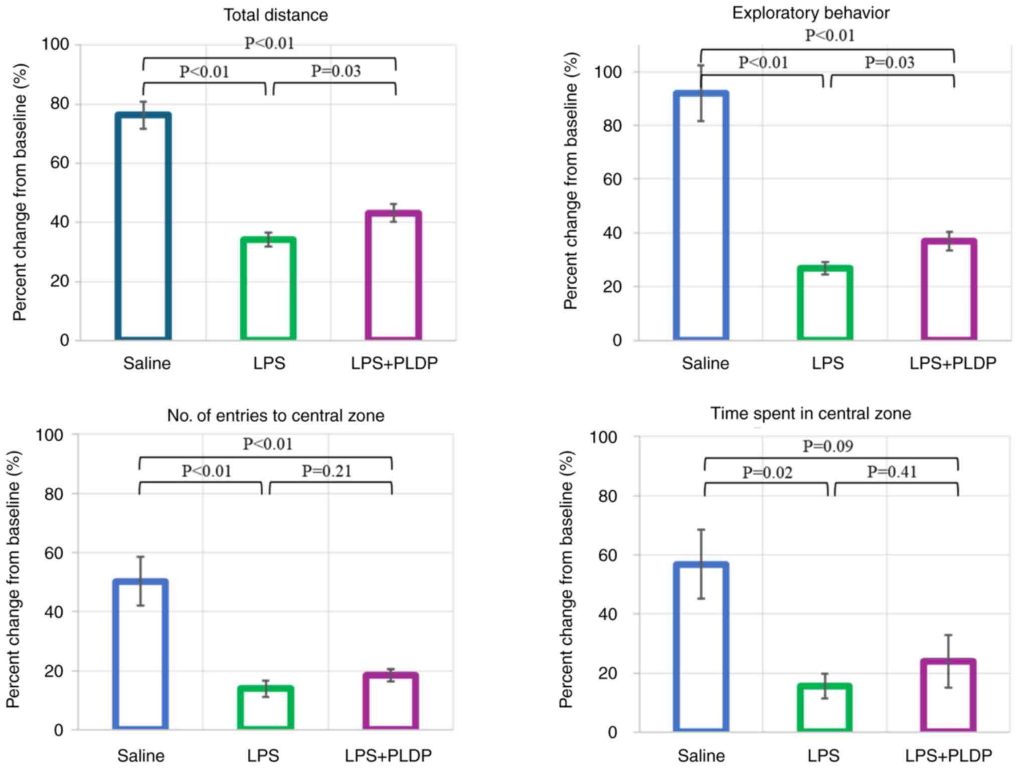 OFT evaluates spontaneous activity and anxiety-like behavior in animals in a novel environment (24). In the present study, the LPS + PLDP group showed significant improvements in spontaneous motor activity and exploratory behavior compared with the LPS group. However, no significant differences were observed in other indices. Mice naturally exhibit ‘thigmotaxis’, a tendency to stay close to the walls the open field (where the body touches the wall), which limits their exploratory behavior toward the center. As a result, it is difficult to accurately assess the effects of PLDP. Nevertheless, the observed improvements in spontaneous motor activity and exploratory behavior may be attributed to the anti-neuroinflammatory effects of PLDP. Altering the dosage and timing of PLDP administration, as well as the duration of OFT, may potentially influence exploratory behavior toward the center.