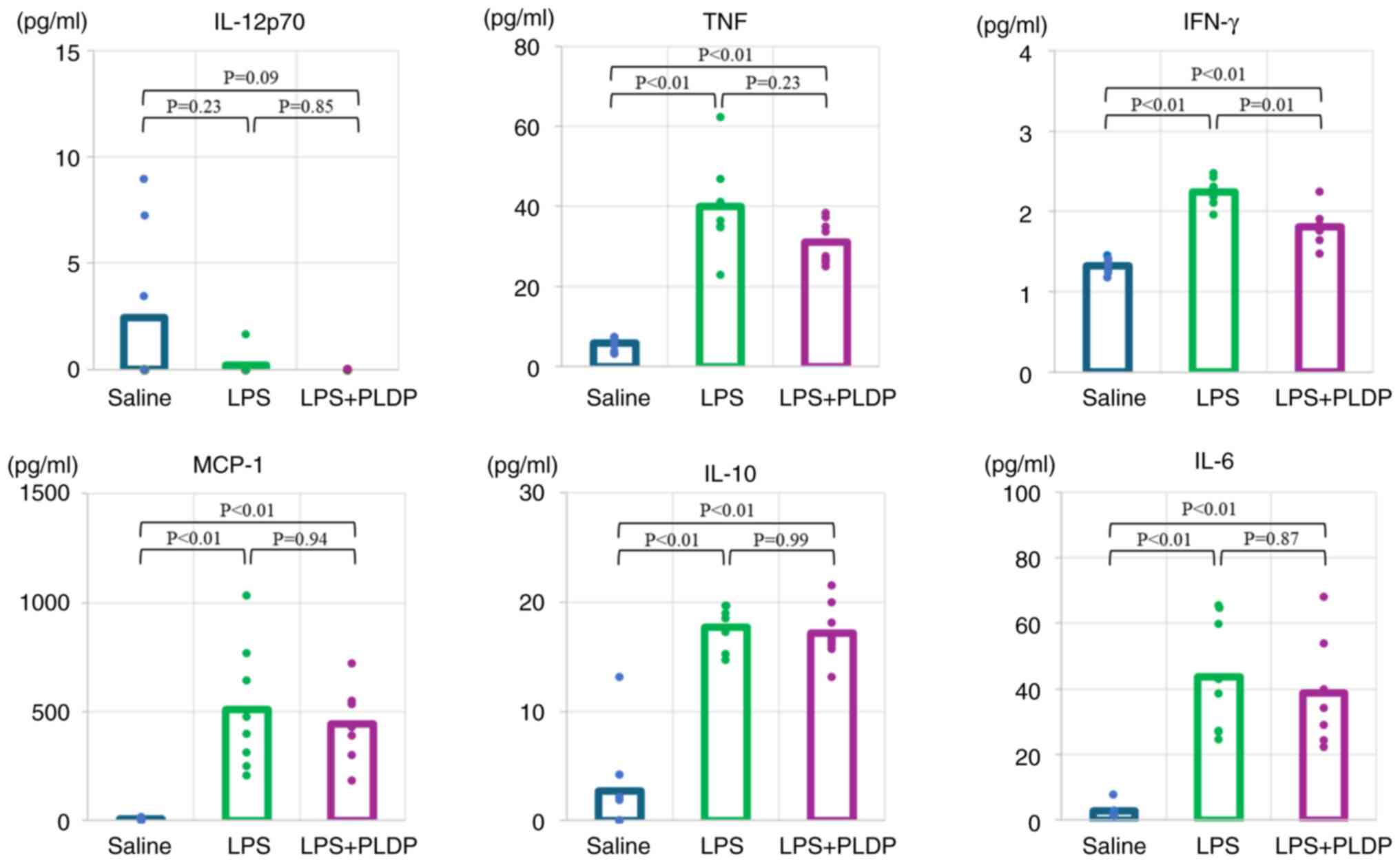 The experimental groups included group 1 (saline), group 2 (LPS), and group 3 (LPS + PLDP). From days 2 to 7 of the experiment, group 3 received orally administered PLDP [0.2 ml/20 g body weight (BW)] while groups 1 and 2 were administered an equivalent volume of saline. The administration periods of PLDP and saline were set based on the papers by Wakasugi et al (16) and Hong et al (17). On the 7th day of the experiment, LPS (E. coli O111:B4) adjusted to 0.1 mg/ml with saline was intraperitoneally administered to groups 2 and 3 at 0.1 ml/20 g BW. Group 1 administered an equal volume of saline only.