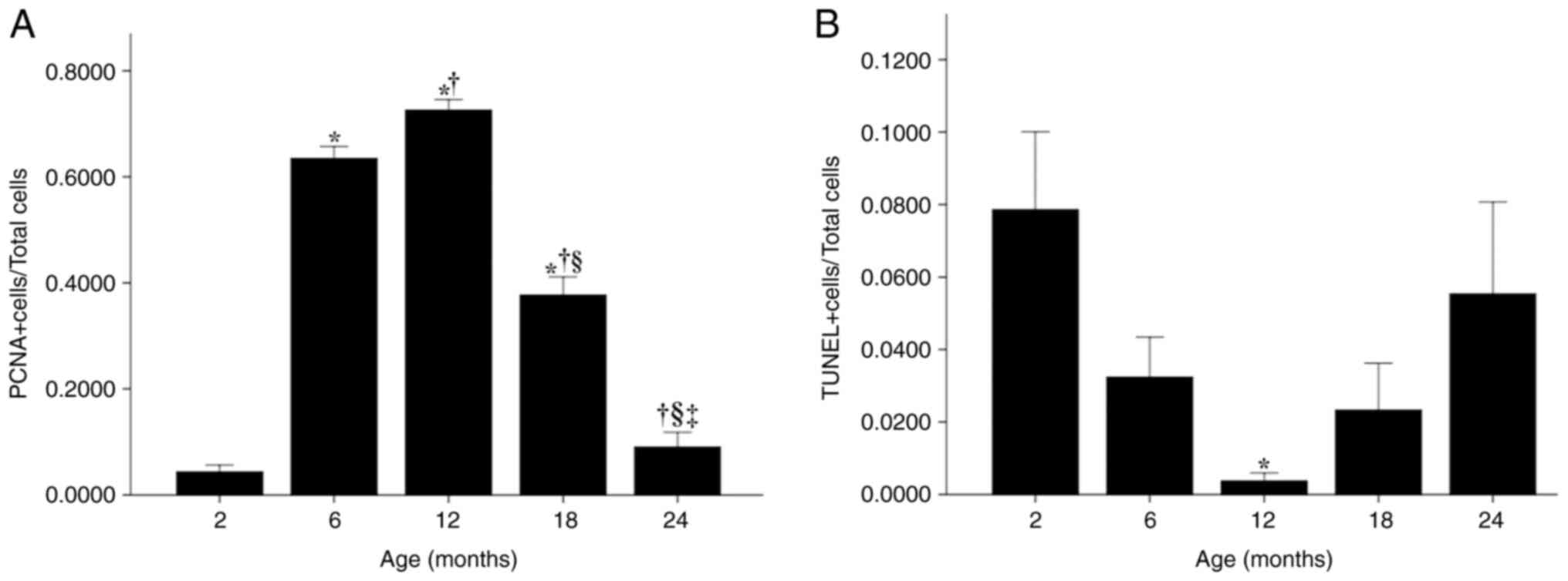 According to the ANOVA test, there was a significant difference in the number of proliferating cells among the analyzed ages (F=163; P<0.001). The results of the Bonferroni test showed that the number of cells undergoing proliferation in mice at 2 months of age (0.0677±0.0136 PCNA + cells/total cells) was significantly lower than in mice at 6, 12, and 18 months of age (0.6852±0.0193, 0.7890±0.0273 and 0.3780±0.0328 PCNA + cells/total cells, respectively; all P<0.001). Mice at 6 months of age had a significantly higher number of proliferating cells than mice at 18 (P<0.001) and 24 (0.0854±0.0262 PCNA + cells/total cells; P<0.001) months of age, but this number was significantly lower than in mice at 12 months of age (P=0.018). In addition, mice at 12 months of age had a significantly higher number of proliferating cells than mice at 18 and 24 months of age (both P<0.001). Finally, mice at 18 months of age had a significantly higher number of proliferating cells than mice at 24 months of age (P<0.001) (Fig. 3A).