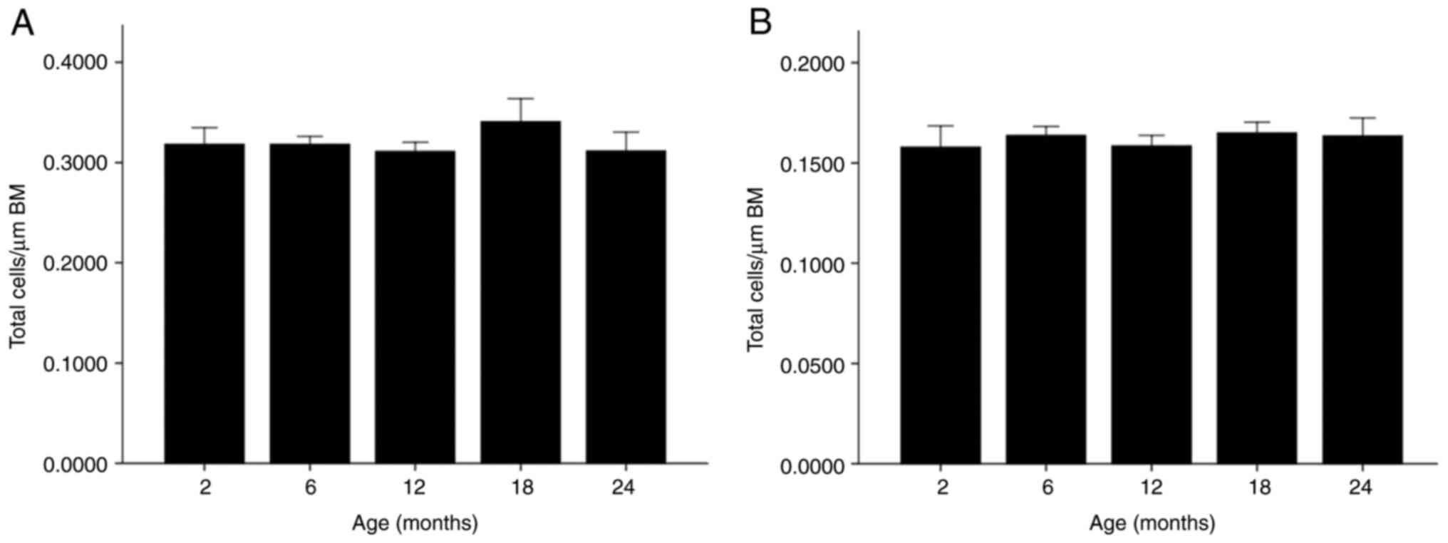 The number of total cells in mice at 2, 6, 12, 18, and 24 months of age was 0.1577±0.0107, 0.1636±0.0045, 0.1584±0.0053, 0.1648±0.0054, and 0.1634±0.0089 total cells/µm BM, respectively. According to the ANOVA test, there was no significant difference in the number of total cells among the analyzed ages (F=0.214; P=0.929) (Fig. 4B).