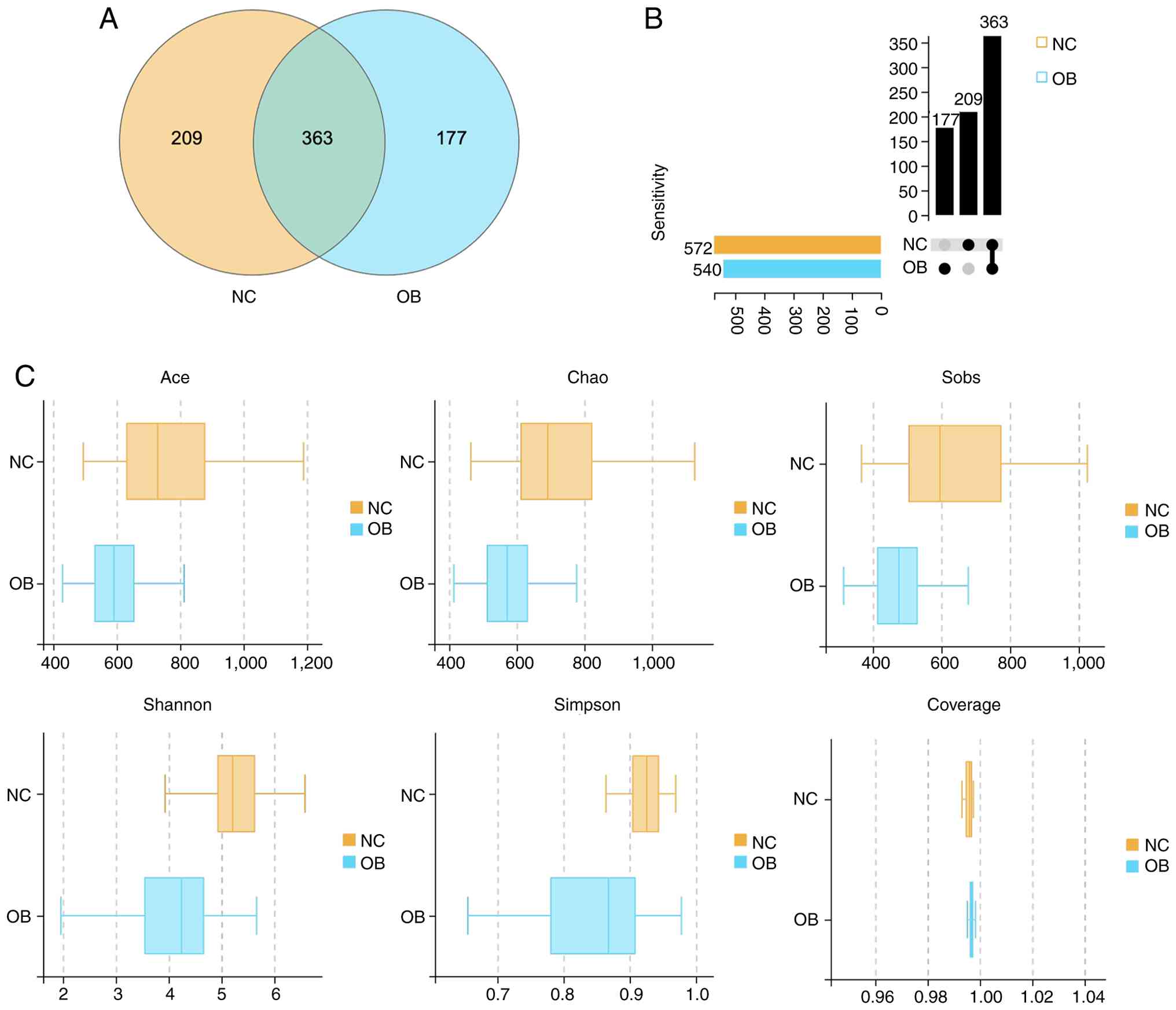 A total of 749 OTUs were obtained following rigorous quality filtration and sequence clustering of 16S rRNA gene reads. Among them, 572 OTUs were identified in the NC group and 540 in the OB group, with 363 OTUs shared across both cohorts. The Venn diagram illustrates the distribution of overlapping and group-specific OTUs (Fig. 1A). To further characterize the pattern of taxa presence and co-occurrence, an UpSet plot was constructed. The plot provided a more granular view of intersection sets and subgroup relationships (Fig. 1B). This visualization offered an intuitive overview of OTU overlap and structural complexity between the groups. To assess within-sample microbial diversity, α diversity indices were calculated and compared between the groups. As shown in Fig. 1C, richness estimators, including Ace, Chao1 and Sobs, were significantly lower in the OB group than in the NC group (P<0.05), indicating a marked reduction in microbial richness. Similarly, Shannon and Simpson indices were decreased in the OB group, reflecting diminished community evenness and overall diversity compared with the NC group. Notably, the Coverage index approached 1 in both groups, confirming sufficient sequencing depth and reliable representation of microbial communities.