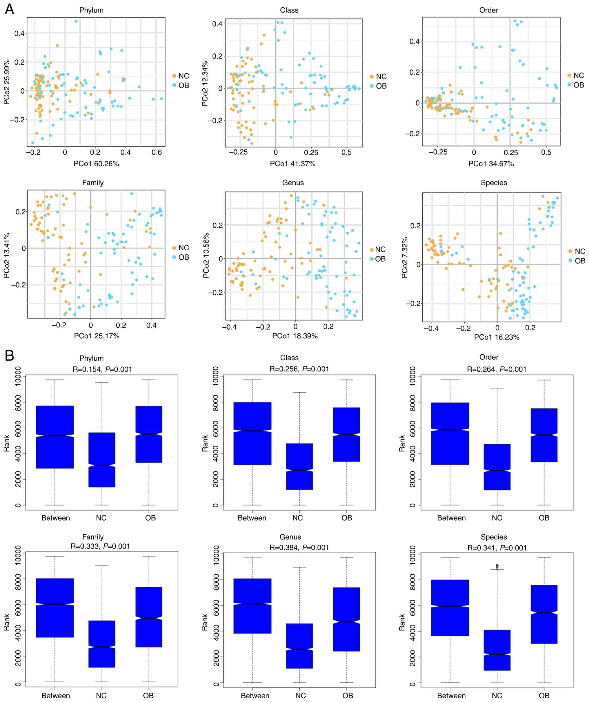 To evaluate the structural variation of the gut microbiota between cirrhotic patients and healthy individuals, β diversity analysis was performed across multiple taxonomic levels. PCoA plots based on Bray-Curtis distances revealed a clear spatial separation between the NC and OB groups at all six taxonomic ranks, from phylum to species (Fig. 2A), indicating distinct community compositions between the groups. The degree of separation appeared more pronounced at lower taxonomic levels, particularly at the genus and species ranks. The ANOSIM results further supported these observations, demonstrating significant dissimilarities between groups at each taxonomic rank (Fig. 2B; r>0.25, P<0.001). Together, these findings illustrate that the gut microbial communities of cirrhotic patients differed markedly from those of healthy controls, suggesting ecological shifts linked to disease progression.