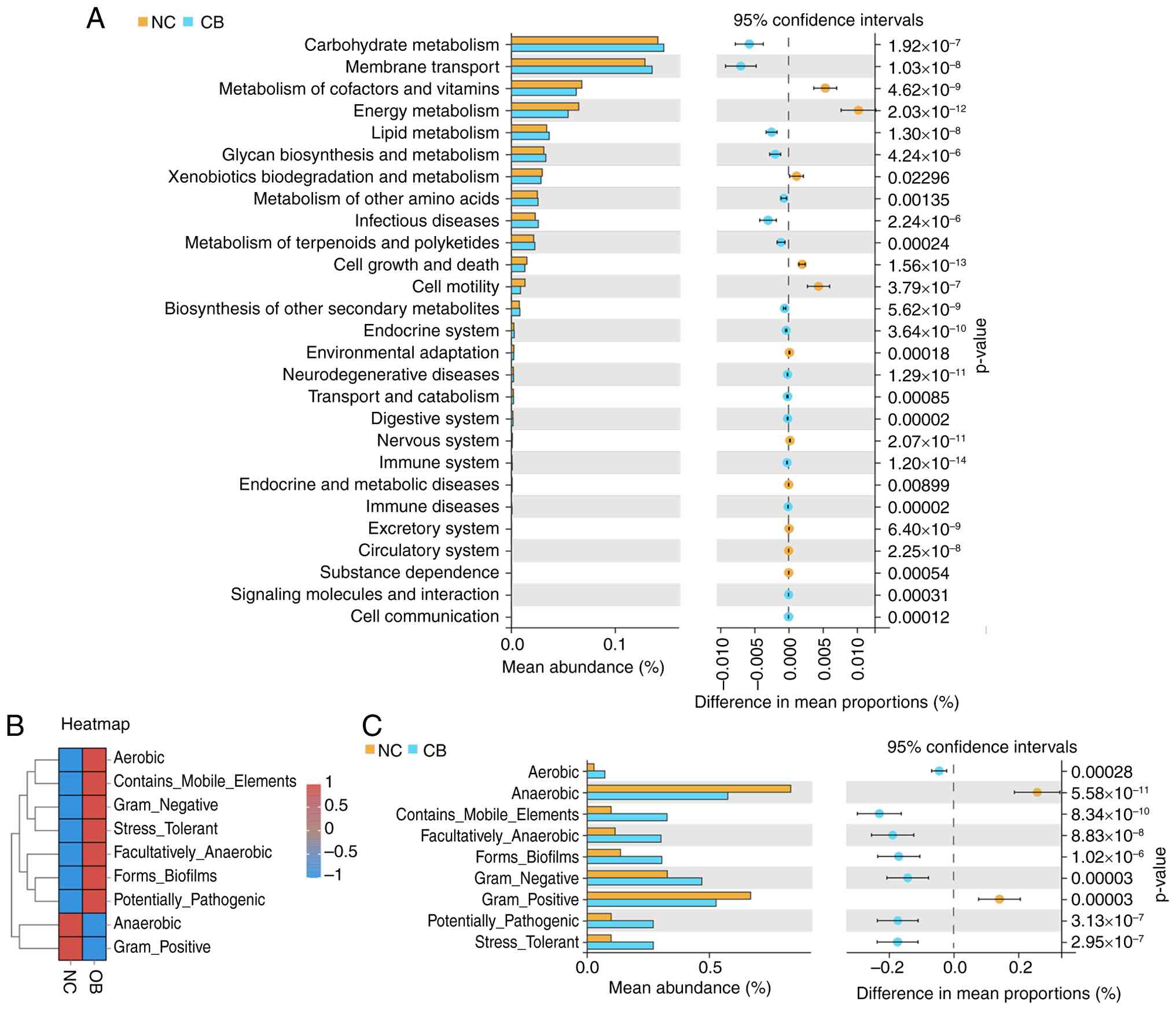 Next, the potential functional differences in the gut microbiota between groups was explored. Microbial gene functions were inferred using PICRUSt2. As displayed in Fig. 3A, the pathways related to ‘Carbohydrate Metabolism,’ ‘Membrane Transport’ and the ‘Metabolism of Cofactors and Vitamins’ were among the most notable predicted functions, with observable differences noted between the NC and OB samples. Several immune- and disease-related pathways, such as those associated with infectious diseases, neurodegenerative disorders and endocrine system regulation, also displayed significant variation. Additionally, microbial phenotypic characteristics were analyzed using BugBase (Fig. 3B and C). The heatmap revealed contrasting trends in phenotypes such as aerobicity, pathogenic potential and biofilm formation between the two cohorts. Quantitative comparisons showed that compared with the NC group, the OB group exhibited higher proportions of ‘Aerobic’, ‘Contains_Mobile_Elements’, ‘Facultatively_Anaerobic’, ‘Forms_Biofilms’, ‘Gram_Negative’, ‘Potentially_Pathogenic’ and ‘Stress_Tolerant’ phenotypes. By contrast, the ‘Anaerobic’ and ‘Gram_Positive’ phenotypes were significantly lower in the OB group (Fig. 3C). These findings suggest that microbial functional capacities and phenotype expression profiles were altered in the OB group, as reflected by distinctions in the predicted pathways and microbial traits.