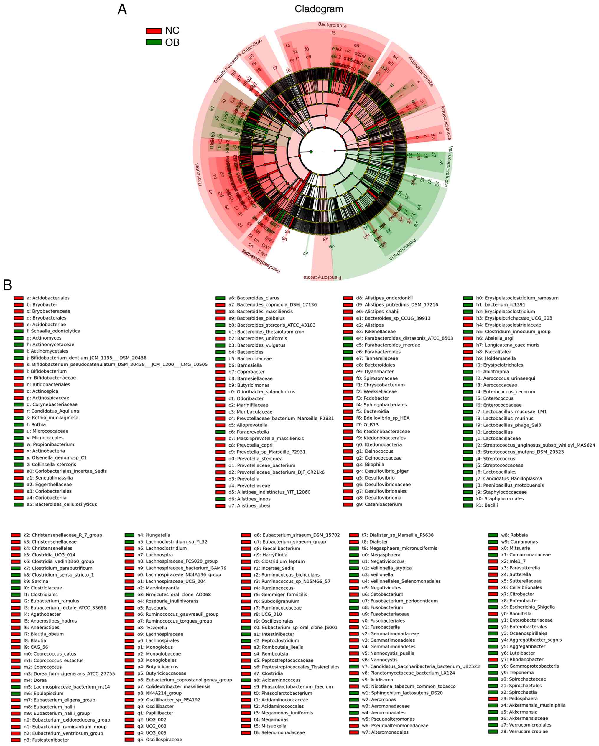 To investigate the taxonomic differences in gut microbiota composition between the OB and NC groups, LEfSe analysis was performed to identify taxa exhibiting differential abundance across taxonomic ranks. The cladogram in Fig. 4A illustrates the phylogenetic structure of these taxa, with color-coded branches representing features associated with either the NC or OB group. Several taxa were found to vary in relative abundance between groups (Fig. 4B). For instance, members of the phyla Bacteroidota and Actinobacteriota appeared more associated with the NC group, while taxa belonging to Firmicutes, including genera such as Clostridium and Lactobacillus, were relatively more abundant in the OB group. These variations were evident across multiple levels of taxonomy, suggesting distinct microbial profiles characterizing the two cohorts.