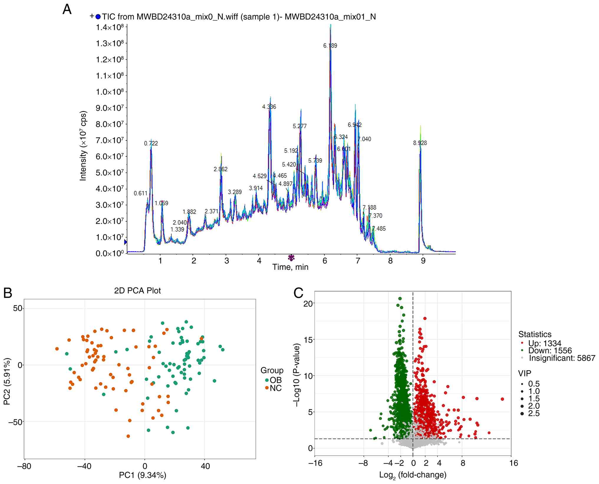 Building on the observed taxonomic differences in gut microbiota, untargeted metabolomic profiling was performed to investigate compositional variations at the metabolite level. Fecal samples from both the OB and NC groups were analyzed using GC-MS and the representative total ion chromatograms showed comparable spectral patterns across samples (Fig. 5A). PCA based on the full metabolite dataset revealed a distributional shift between the OB and NC groups (Fig. 5B), with samples from each cohort forming distinguishable clusters. This suggests divergence in global metabolic features between the two groups. Differential metabolite screening further identified a wide array of altered features. A total of 8,777 metabolites were detected, among which 1,334 exhibited increased abundance and 1,556 were decreased in the OB group compared with the NC group (Fig. 5C). To highlight the most relevant metabolic shifts, the top 20 upregulated and downregulated metabolites based on fold change and P-value are summarized in Tables II and III, respectively. These tables provide detailed chemical information, statistical significance and fold changes of the most altered compounds, thereby offering a clearer view of the molecular disturbances associated with the OB group. These results offer an initial view of metabolic alterations between the OB and NC groups.