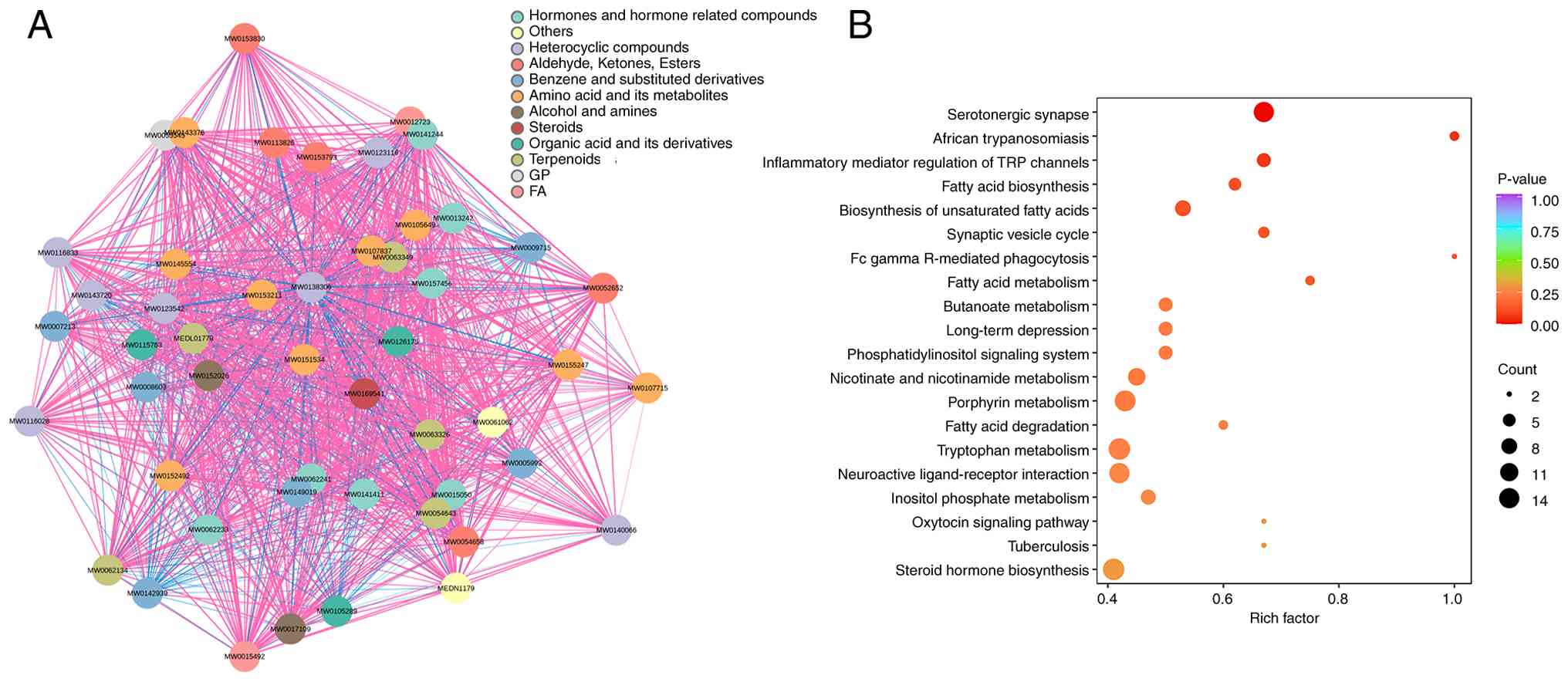 Based on the screened differential metabolites, a compound network was constructed to illustrate chemical associations and structural classifications. Metabolites were categorized into groups such as amino acid derivatives, steroids, fatty acids and heterocyclic compounds, with dense interconnections observed both within and between chemical classes (Fig. 6A). Then, KEGG pathway enrichment was conducted using the annotated metabolites. A range of pathways were implicated, including those involved in neurotransmitter signaling (such as ‘Serotonergic synapse’), lipid metabolism (such as ‘Fatty acid biosynthesis’ and ‘Fatty acid degradation’) and hormonal regulation (such as ‘Steroid hormone biosynthesis’ and ‘Oxytocin signaling pathway’) (Fig. 6B).