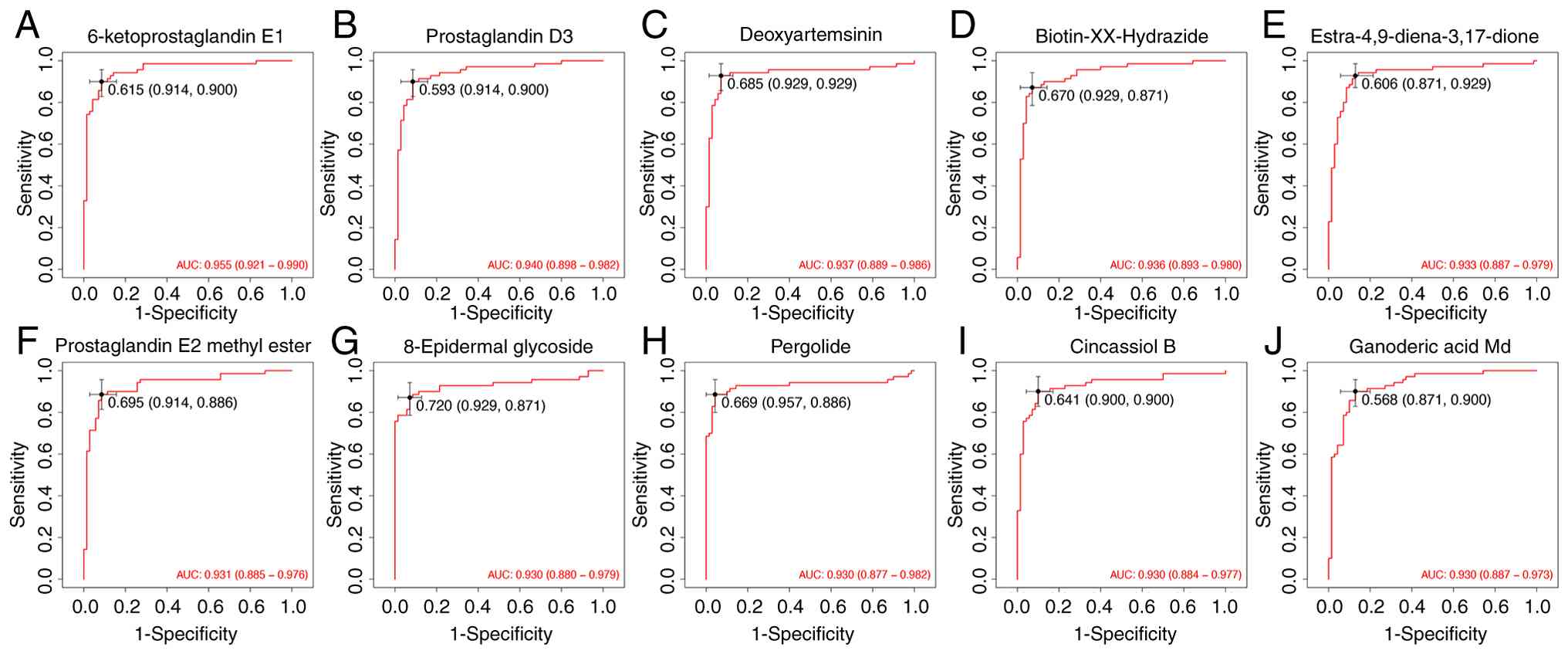 The present study further assessed the classification potential of key metabolites with receiver operator characteristic curve analysis. A total of 10 representative metabolites were selected based on their relevance in prior screening and annotation. All selected metabolites yielded area under the curve (AUC) values ≥0.93, with the highest observed for 6-ketoprostaglandin E1 (AUC=0.955). Other compounds such as prostaglandin D3 (AUC=0.940), deoxyartemisinin (AUC=0.937) and ganoderic acid Md (AUC=0.930) also exhibited strong classification performance. The full list included: biotin-XX-hydrazide (AUC=0.936), estra-4,9-diene-3,17-dione (AUC=0.933), prostaglandin E2 methyl ester (AUC=0.931), 8-epidermal glycoside (AUC=0.930), pergolide (AUC=0.930) and cincassiol B (AUC=0.930) (Fig. 7). These results suggest that the identified features may have contributed to group differentiation in the metabolomics cohort and provide reference for subsequent validation efforts.