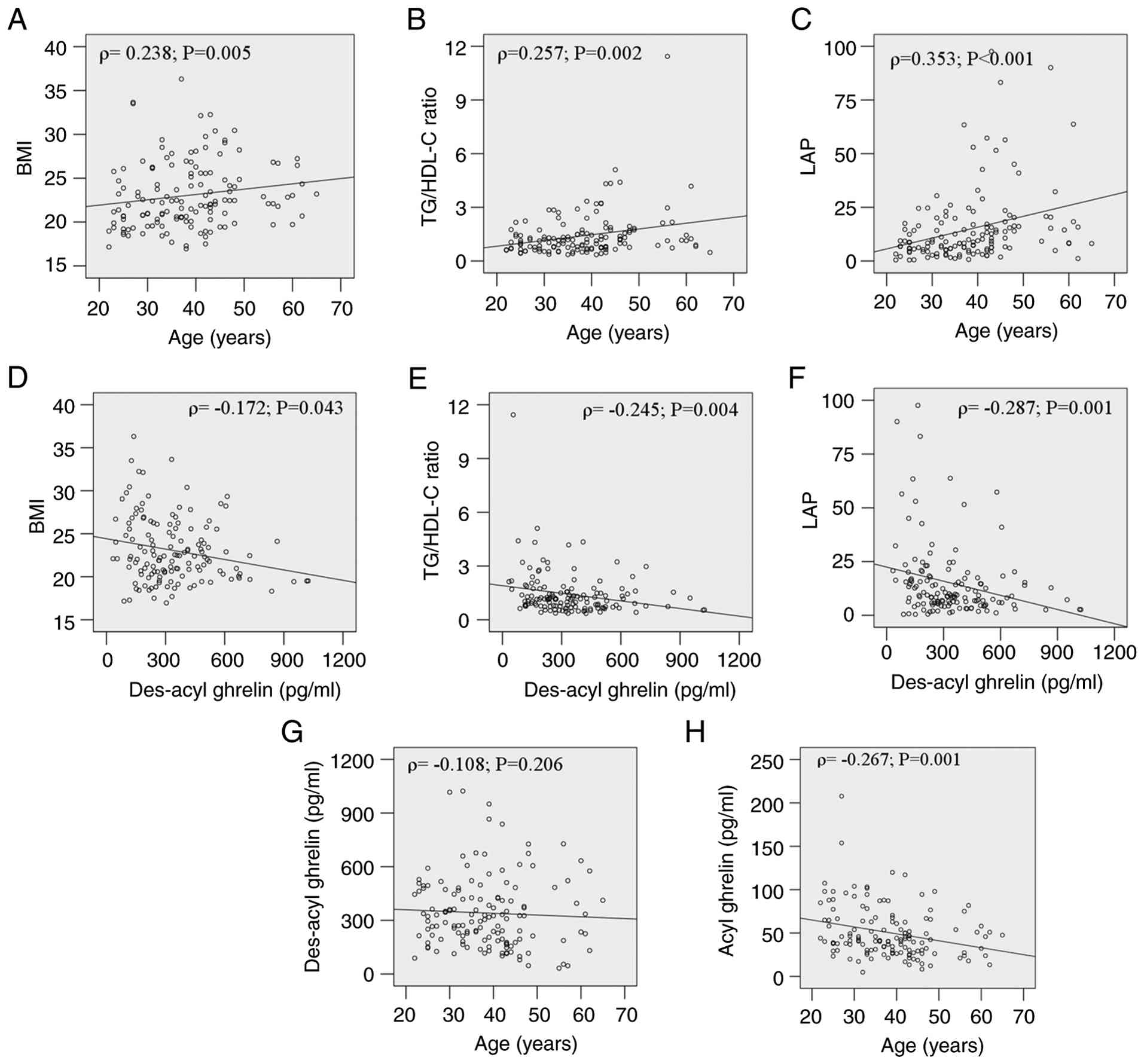 Bivariate correlation analysis revealed significant associations between age, GEPH and metabolic outcomes (Table II; Fig. 1). Age, serum acyl ghrelin and des-acyl ghrelin correlated positively with BMI and TG/HDL-C ratio, while age, serum acyl ghrelin, des-acyl ghrelin and obestatin were correlated with LAP. Age also had a significant relationship with ALT. No correlation existed between age and des-acyl ghrelin (Fig. 1G), while acyl-ghrelin declined significantly with age (Fig. 1H). Despite these bivariate associations, forward-selected multivariate regression models using age and all GEPHs as candidate variables identified independent predictors for metabolic abnormalities (Table III). Age positively predicted BMI (β=0.060), WC (β=0.223), FBS, TG, TC and LDL-C. Des-acyl ghrelin was independently associated with BMI (β=-0.004) and WC (β=-0.014) but positively associated with HDL-C (β=0.023). Obestatin predicted FBS (β=2.028). Notably, while significant in the bivariate correlations (Table II), acyl-ghrelin was not retained in the final forward-selected model (Table III) as it did not meet the statistical criterion for entry after accounting for variance explained by the other variables. Overall, age was the strongest predictor, associated with all sevenmetabolic parameters . Among GEPHs, des-acyl ghrelin showed the significant associations with the highest number of metabolic parameters (3/7), while other GEPHs showed significant associations with ≤1 parameter (Table III).