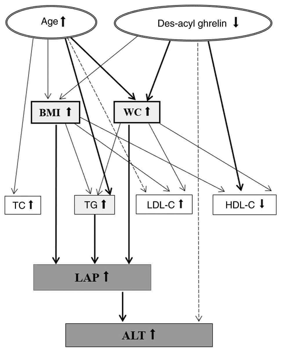 GEPHs retained in the final model (des-acyl ghrelin, and obestatin) and age underwent exploratory path analysis, Mahalanobis distance-based classification was applied. P<0.05 was considered to indicate a statistically significant difference.